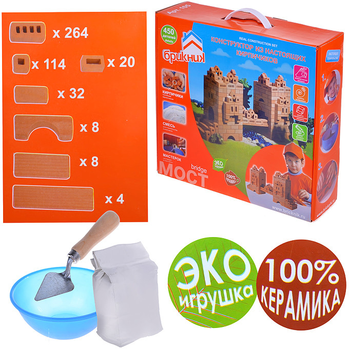 Brickmaster Конструктор «Мост»В данный момент этот товар отсутствует в продаже. Возможно, у нас найдется аналогичный или похожий товар здесь. Конструктор Brickmaster — станет отличным подарком Вашему малышу на любой праздник. Благодаря этому развивающему набору можно создать атмосферу самой настоящей стройки. Кирпичики сделаны из натуральной обожженной глины по той же технологии, что и настоящие, только отличаются меньшим размером. Экологически безопасная специальная смесь позволит крепко соединить между собой детали конструкции. Она не только обладает всеми свойствами настоящего цемента, но также позволяет при необходимости несколько раз перестраивать конструктор: достаточно готовую постройку поместить на 2-3 часа в воду и все кирпичики снова отделятся друг от друга. Конструктор из кирпичиков развивает у ребенка мелкую моторику, фантазию, логическое мышление, а также требует внимательности, аккуратности и усидчивости. |