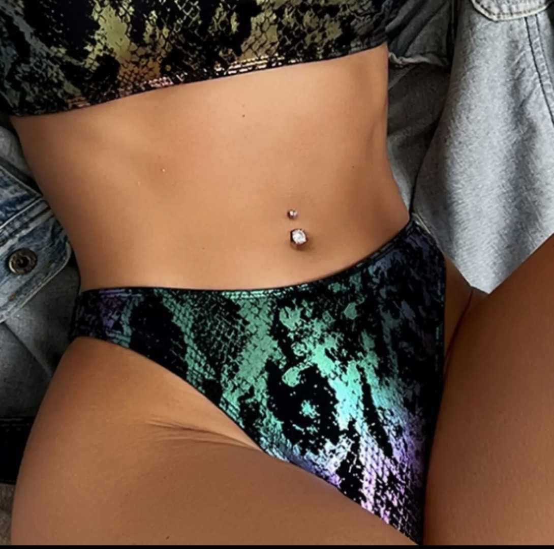 Низ — трусики-стринги с регулируемыми завязками, которые акцентируют внимание на изгибах тела и визуально удлиняют ноги. Они создают гармоничный, соблазнительный образ, в котором ты будешь сиять на пляже, у бассейна или во время летних вечеринок.