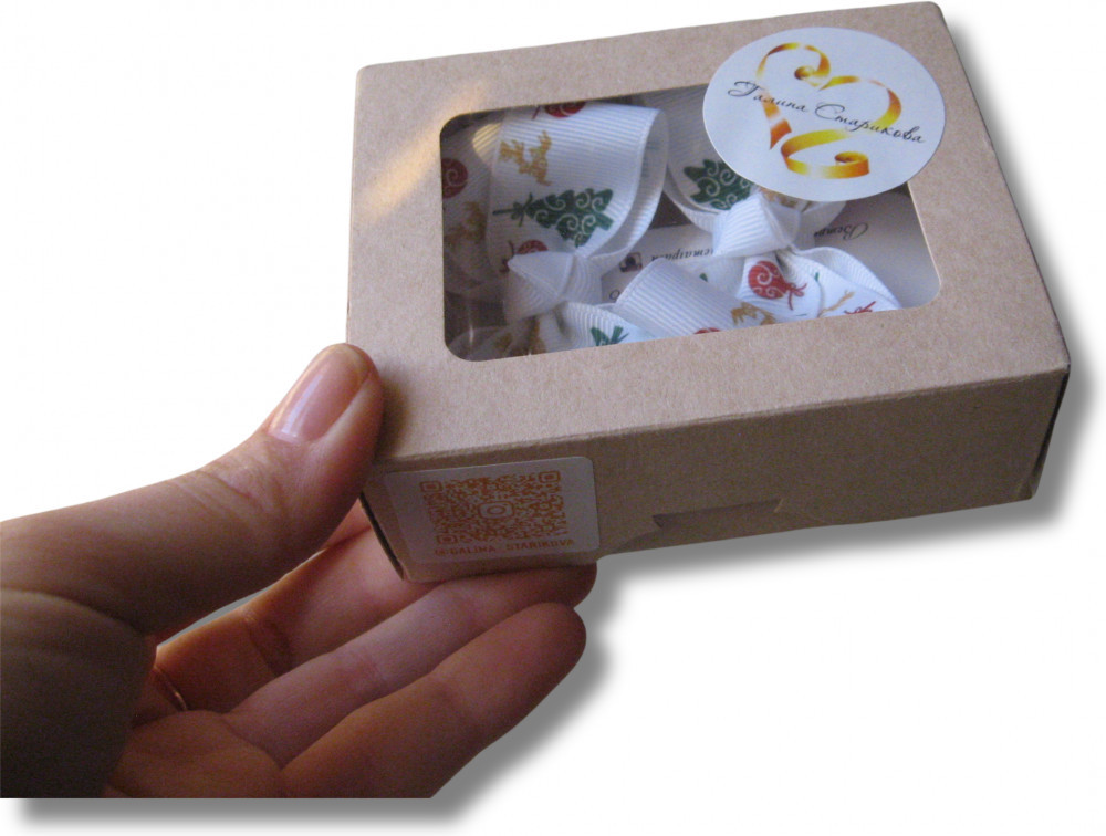 В наборе бантики — 2 шт, упаковка — крафт-коробочка.