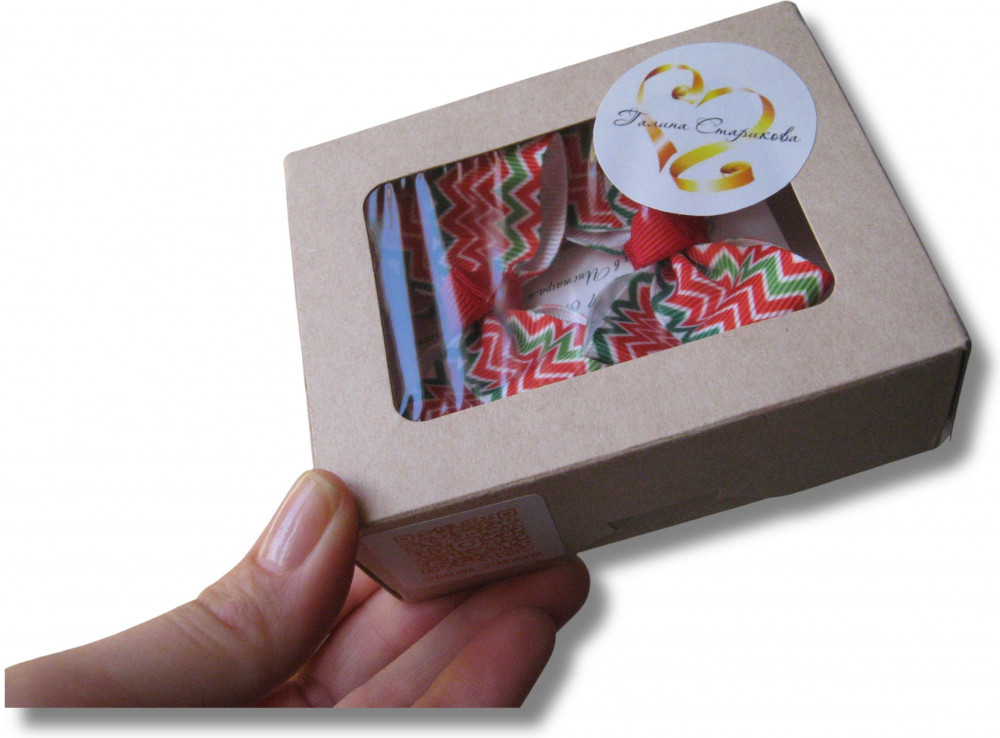 В наборе бантики — 2 шт, упаковка — крафт-коробочка.