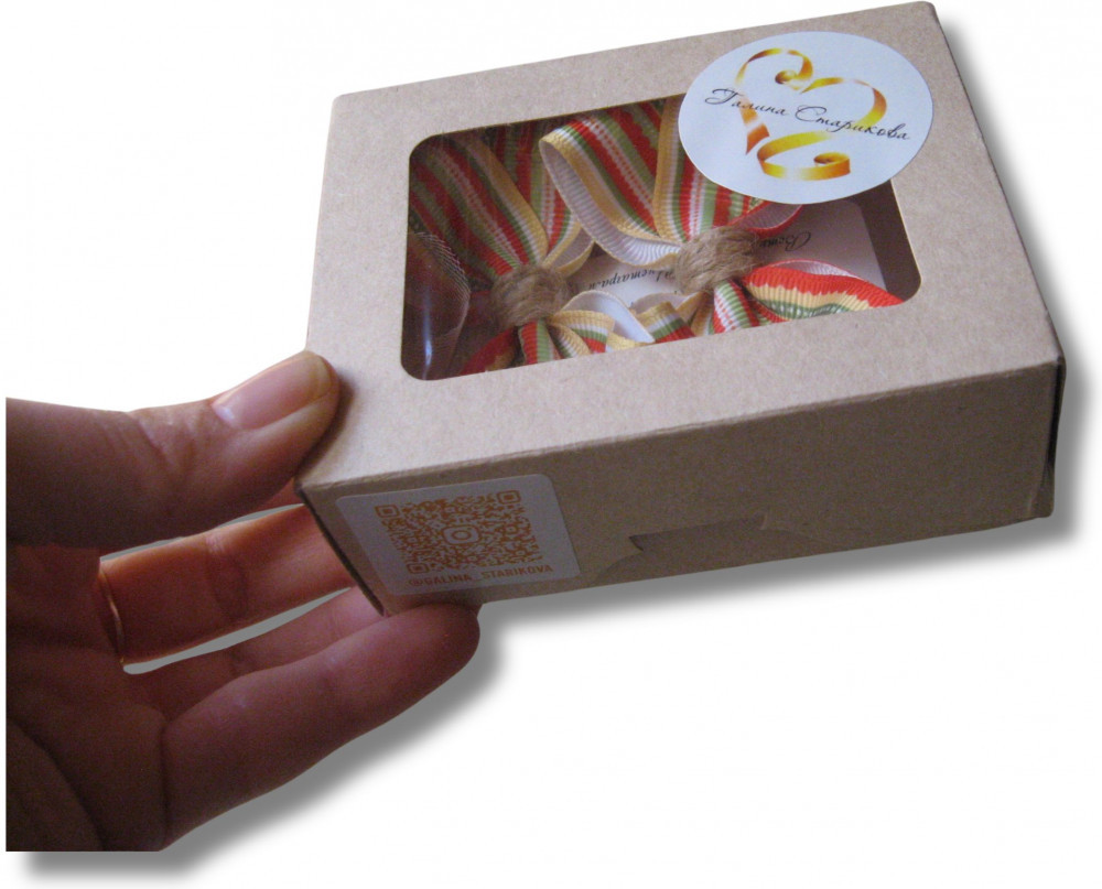 В наборе бантики — 2 шт, упаковка — крафт-коробочка.