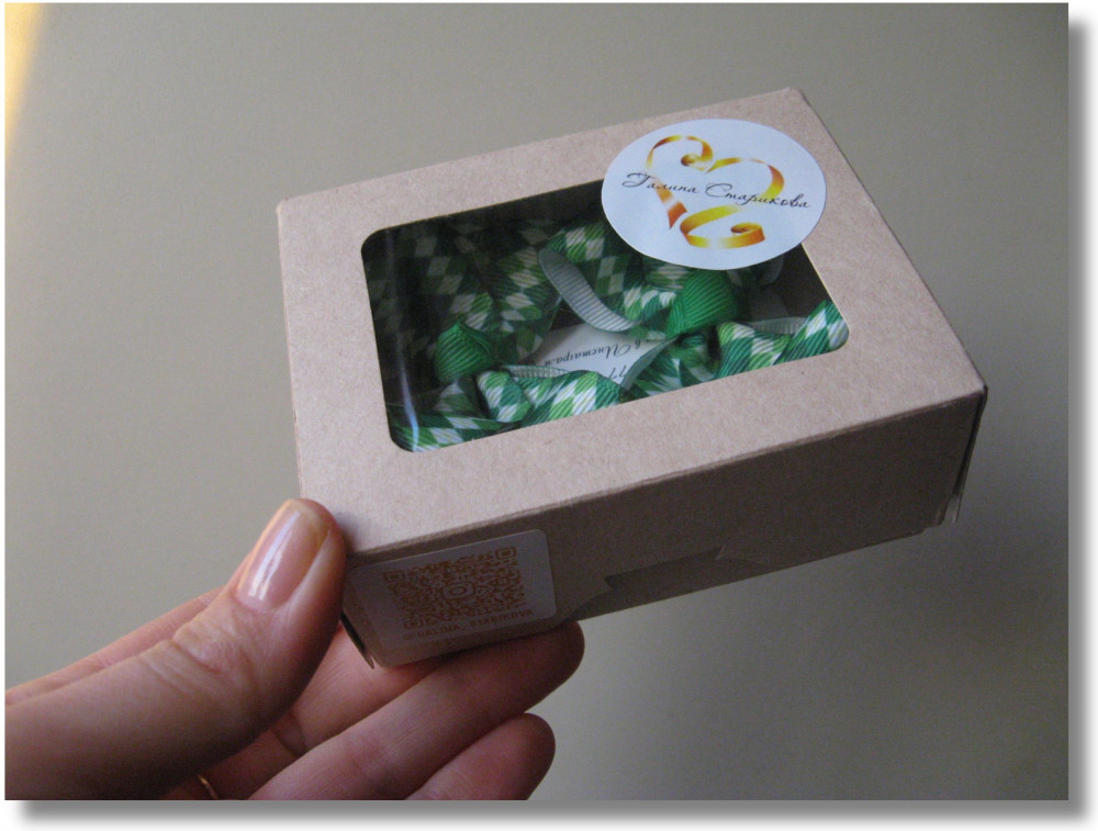 В наборе бантики — 2 шт, упаковка — крафт-коробочка.