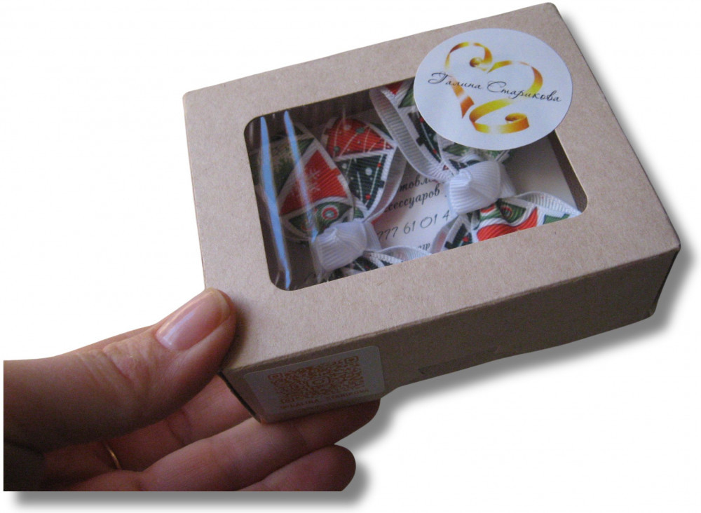 В наборе бантики — 2 шт, упаковка — крафт-коробочка.