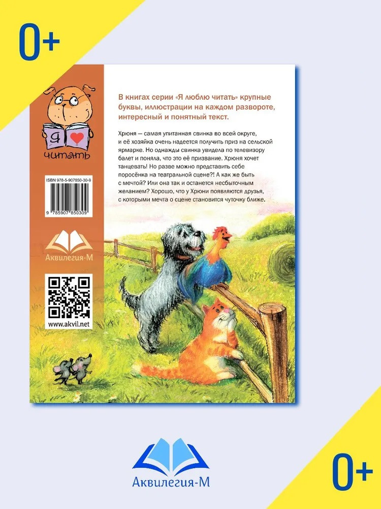 💳 Оплатить за товар можно при получении 🇰🇿 Есть бесплатная доставка по Казахстану 🎁 Копите бонусы с каждой покупки Хрюня — самая упитанная свинка во всей округе, и её хозяйка очень надеется получить приз на сельской ярмарке. Но однажды свинка увидела по телевизору балет и поняла, что это её призвание. Хрюня хочет танцевать! Но разве можно представить себе поросёнка на театральной сцене?! А как же быть с мечтой? Или она так и останется несбыточным желанием? Хорошо, что у Хрюни появляются друзья, с которыми мечта о сцене становится чуточку ближе. |