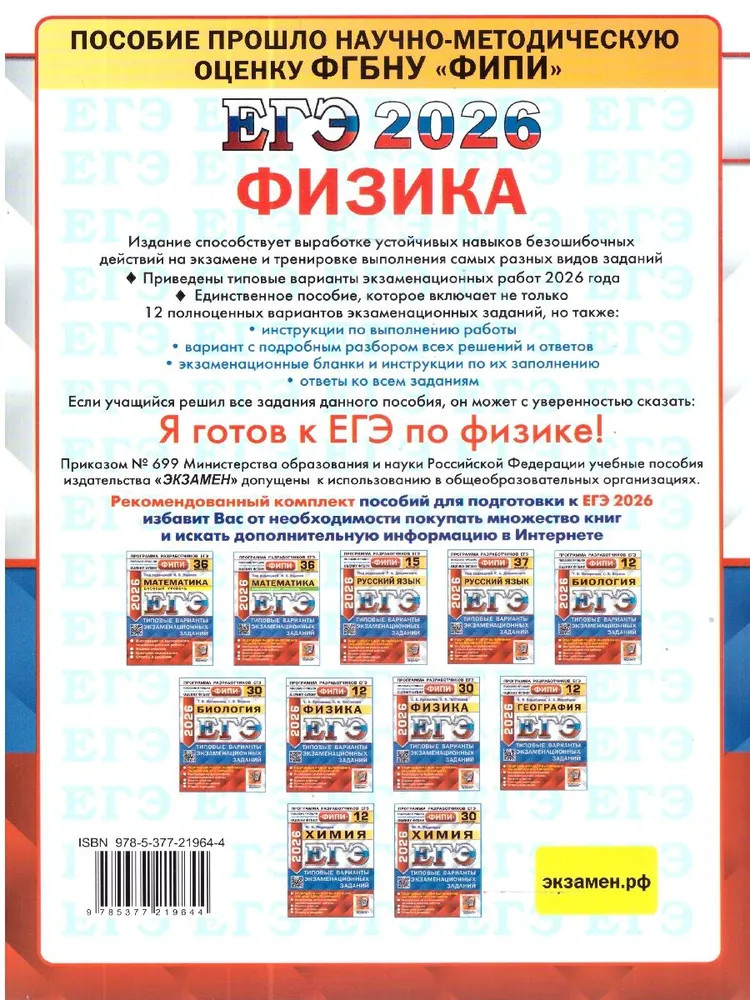 Серия: ЕГЭ Одобрено ФИПИ Пособие прошло научно-методическую оценку ФГБНУ «ФИПИ». Пособие содержит 12 типовых вариантов экзаменационных заданий Единого государственного экзамена по физике. Назначение пособия — предоставить возможность обучающимся отработать навыки выполнения заданий, аналогичных заданиям, представленным в демонстрационной версии ЕГЭ по физике. Пособие адресовано учителям для подготовки учащихся к Единому государственному экзамену, а учащимся-старшеклассникам — для самоподготовки и самоконтроля. Приказом № 699 Министерства образования и науки Российской Федерации учебные пособия издательства «Экзамен» допущены к использованию в общеобразовательных организациях. |