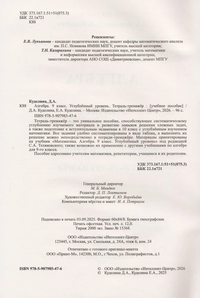 💳 Оплатить за товар можно при получении 🇰🇿 Есть бесплатная доставка по Казахстану 🎁 Копите бонусы с каждой покупки Тетрадь-тренажёр — это уникальное пособие, способствующее систематическому углублению изучаемого материала и развитию навыков решения сложных задач, а также подготовке к вступительным экзаменам в 10 класс с углублённым изучением математики. Все задания удобно систематизированы в виде таблиц, а выполнять их решение можно непосредственно в тетради-тренажёре. Материалы ориентированы на учебник «Математика. Алгебра. 9 класс. Углублённый уровень» под редакцией С. А. Теляковского; также возможно их применение с другими учебниками по алгебре для 9-го класса. Пособие адресовано учителям математики, репетиторам, учащимся и их родителям. |