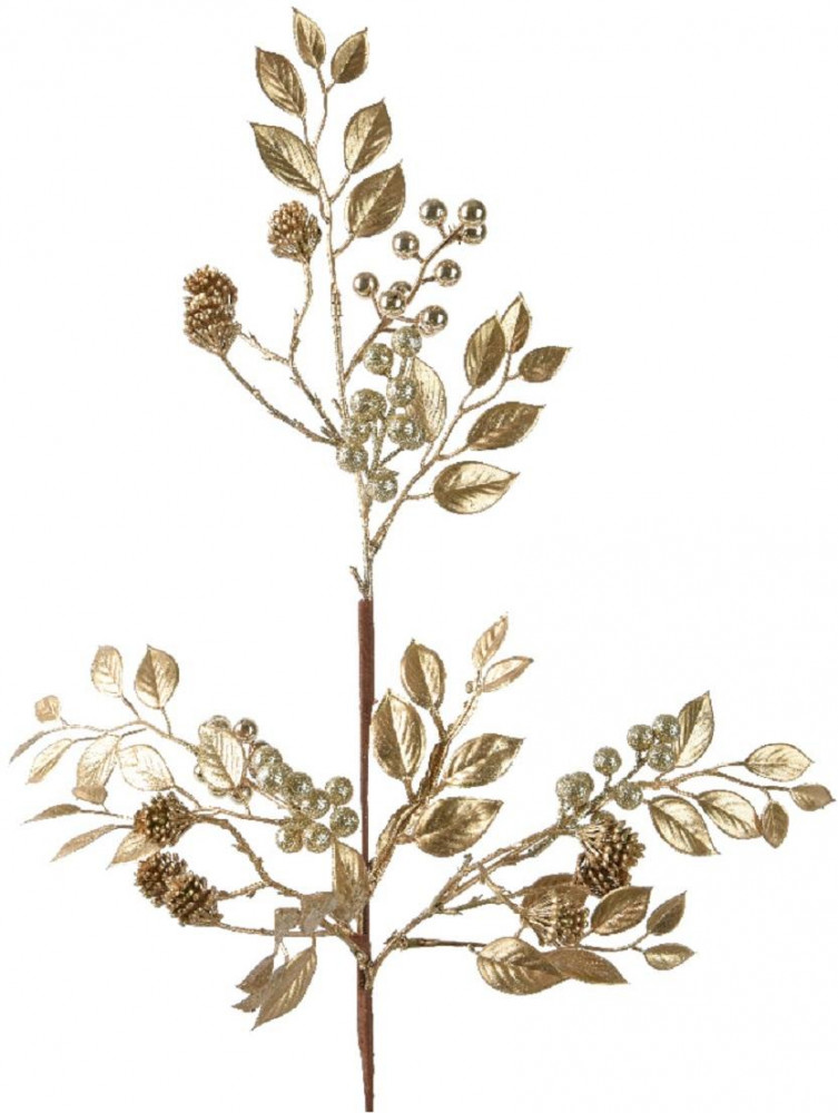 Добавьте вашему новогоднему убранству нотку изысканного блеска и элегантности с этой роскошной декоративной веточкой из Голландии. Выполненная в благородном золотистом цвете, она украшена миниатюрными ягодами и шишками, которые деликатно мерцают в свете праздничных огней. При высоте 68 см, эта ветвь станет выразительным акцентом в любом интерьере. Поставьте ее в высокую напольную вазу для создания эффектной самостоятельной композиции или используйте несколько веточек, чтобы придать объем и сияние вашему рождественскому венку или хвойной гирлянде. Она идеально подходит для оформления праздничного стола, добавляя ему торжественности и шика.