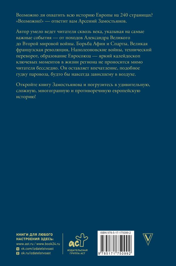 💳 Оплатить за товар можно при получении 🇰🇿 Есть бесплатная доставка по Казахстану 🎁 Копите бонусы с каждой покупки Серия: Лучшее в истории Возможно ли охватить всю историю Европы в 240 страницах? Возможно! — ответит вам Арсений Замостьянов. Автор умело ведет читателя сквозь века, указывая на самые важные события — от походов Александра Великого до Второй мировой войны. Борьба Афин и Спарты, Великая Французская революция, Наполеоновские войны, технический переворот, образование Евросоюза — яркий калейдоскоп ключевых моментов в жизни региона не проносится мимо читателя бесследно. Он оставляет впечатление, подобное гудку паровоза, будто бы навсегда зависшему в воздухе. Откройте книгу Замостьянова и погрузитесь в удивительную, сложную, многогранную и противоречивую европейскую историю! |