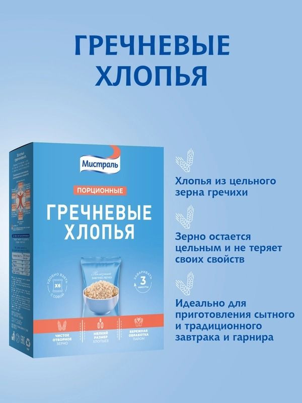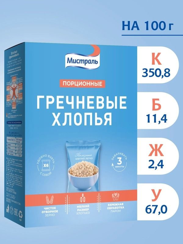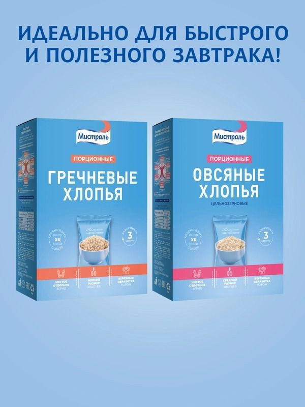 Хлопья «Мистраль» гречневые порционные — это 100% натуральный продукт из цельного зерна гречки, расфасованный в удобные пакеты по 40 г. Они быстро готовятся, сохраняя пользу и вкус гречки. Богаты белком, клетчаткой и минералами, обеспечивают длительное чувство сытости и энергию на весь день. Идеальны для здорового завтрака дома или в дороге. Порционные упаковки позволяют удобно и быстро приготовить завтрак, не тратя время на подготовку и измерение ингредиентов. Каждая порция идеально рассчитана для одного приема пищи, что делает их особенно удобными для людей с насыщенным графиком, студентов, семейных пар или тех, кто следит за рационом. Просто залейте хлопья горячей или холодной водой, молоком или альтернативными напитками — и ваш вкусный и полезный завтрак готов! Благодаря нейтральному вкусу и легкой текстуре, гречневые хлопья отлично сочетаются с разнообразными добавками: свежими фруктами, ягодами, орехами, медом или йогуртом, что позволяет каждому создать свой уникальный вкус.