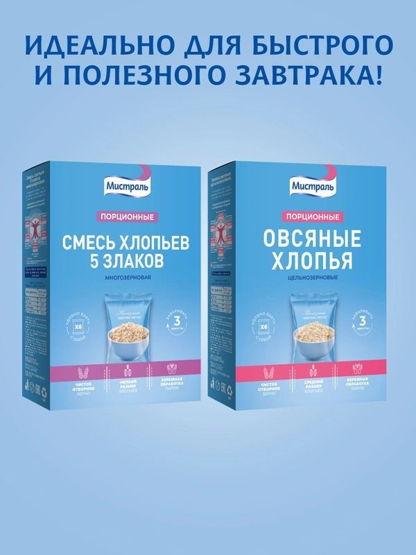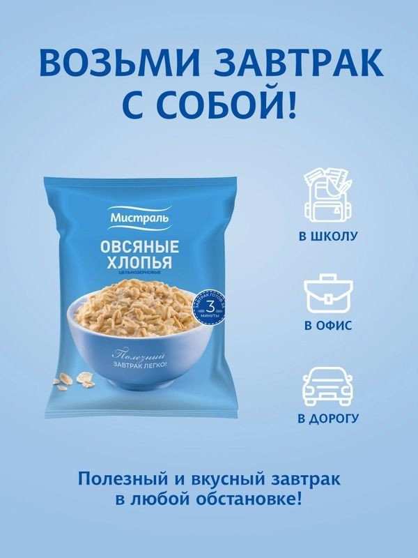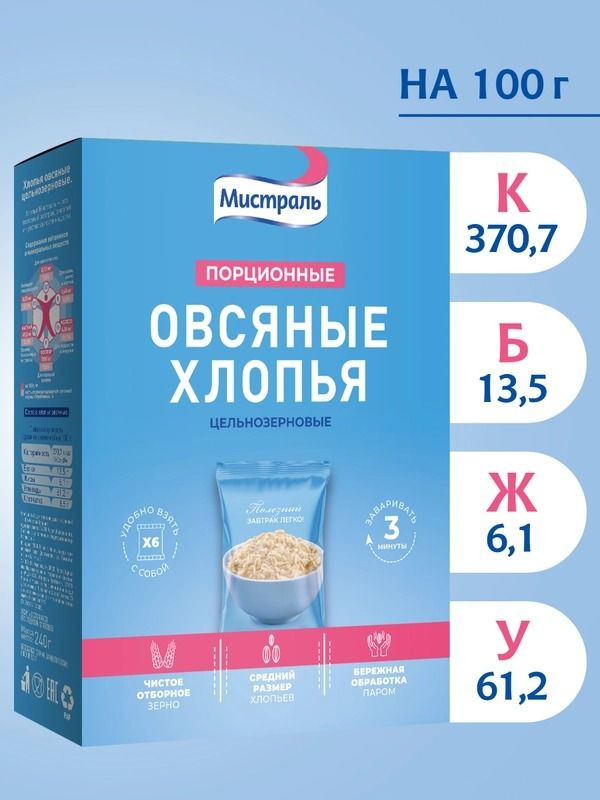 Хлопья «Мистраль» овсяные порционные — это натуральные хлопья из цельного овса в удобной упаковке по 40 г. Они сохраняют все полезные свойства злаков, богаты клетчаткой и витаминами. Быстро готовятся, обеспечивая заряд энергии и сытости на долгое время. Отличный выбор для здорового и вкусного завтрака дома, в офисе или в дороге. Порционная упаковка обеспечивает удобство использования — достаточно открыть пакет и приготовить свежий, питательный завтрак за считанные минуты. Такой формат идеально подходит для занятых людей, студентов и тех, кто ценит быстрое и полезное питание. Хлопья овсяные богаты клетчаткой, витаминами и минералами, что способствует улучшению работы пищеварительной системы, поддержанию энергии и укреплению иммунитета. Они помогают снизить уровень холестерина и стабилизировать уровень сахара в крови, делая их отличным выбором для тех, кто следит за своим здоровьем и фигурой.