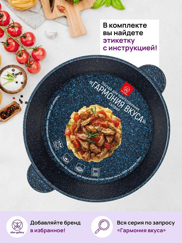 Жаровня Elan Gallery «Сапфир» из серии «Гармония вкуса» предназначена для приготовления горячих блюд. Размер изделия — 35×29×14.5 см, объём — 4.5 литра. Высота без крышки — 9 см, высота внутренней части — 8,4 см, диаметр дна — 22 см. Сотейник изготовлен из толстостенного алюминия и имеет ультрапрочное двухслойное антипригарное покрытие Cookmark. Оно устойчиво к износу и царапинам, не содержит PFOA и других вредных веществ, что делает его полностью безопасным для здоровья. Толстые стенки и плотно прилегающая крышка из жаропрочного стекла создают при нагреве эффект духовки. Пароотвод обеспечивает равномерную циркуляцию. Жар распределяется по изделию таким образом, что продукты надолго сохраняют свои сочность, аромат и полезные свойства. Красивая алюминиевая жаровня — мечта любой хозяйки. С её помощью вы легко приготовите вкусную пищу дома и на даче. Используйте глубокий сотейник для приготовления мясных, рыбных и овощных блюд. Это универсальная кухонная утварь, подходящая для варки, жарки и тушения. Приготовьте в ней плов, бульон или самые разнообразные угощения из мяса, рыбы и овощей.