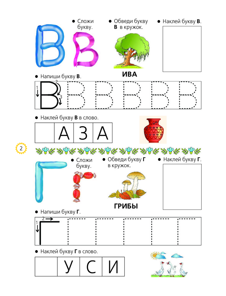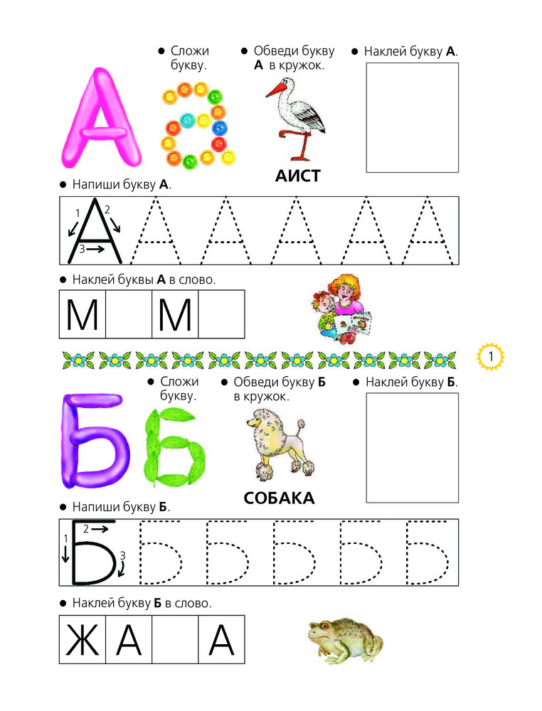 Ничего особенного. Пол странички на каждую букву. По паре наклеек на каждую букву. Строчка для обводки по точкам.