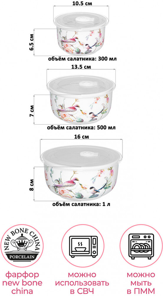 Серия: Певчие птички Набор 3 салатников из серии «Певчие птички» от Elan Gallery предназначен для эстетичной сервировки вашего стола. Включает в себя изделия разных размеров: 16×16×8 см (объём — 1 литр, размер без крышки — 15×15×7.5 см), 13.5×13.5×7 см (объём — 500 мл, размер без крышки — 12.5×12.5×6.5 см) и 10.5×10.5×6.5 см (объём — 300 мл, размер без крышки — 10.5×10.5×6.5 см). Выполнены из фарфора нового поколения new bone china, сочетающего в себе изящность и высокую прочность. Такие изделия легко отмываются, поэтому сохраняют привлекательный вид и практичны в использовании. От других видов костяного фарфора new bone china отличается большей экологичностью в производстве. Изделия украшены рисунком пёстрых птичек и пышных бутонов роз. Они выполнены в манере, вдохновлённой акварельным рисунком. Крышки выполнены из пластика и оснащены силиконовыми уплотнителями. |