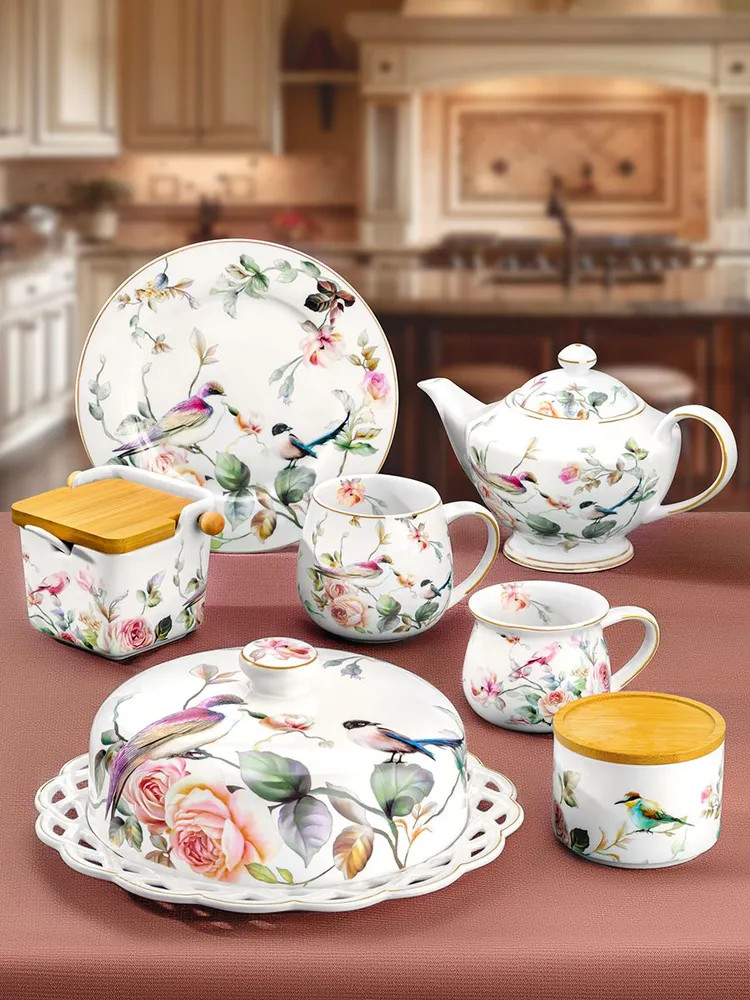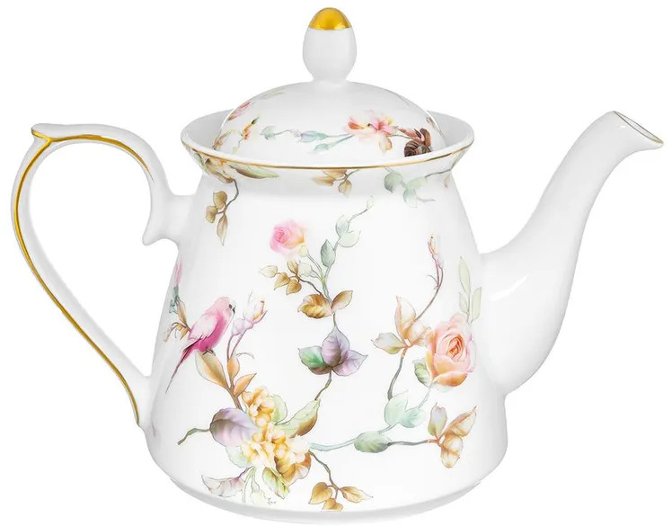 Чайник из серии «Певчие птички» от Elan Gallery предназначен для эстетичной сервировки вашего стола. Размер ёмкости — 23×13×17 см, объём — 1 литр. Выполнен из фарфора нового поколения new bone china, сочетающего в себе изящность и высокую прочность. Такие изделия легко отмываются, поэтому сохраняют привлекательный вид и практичны в использовании. Плотная структура материала позволяет посуде дольше сохранять температуру блюд и напитков. От других видов костяного фарфора new bone china отличается большей экологичностью в производстве. Изделие украшено рисунком пёстрых птичек и пышных бутонов роз. Они выполнены в манере, вдохновлённой акварельным рисунком. Тонкая золотистая окантовка служит деликатным акцентом и подчёркивает их изысканность.
