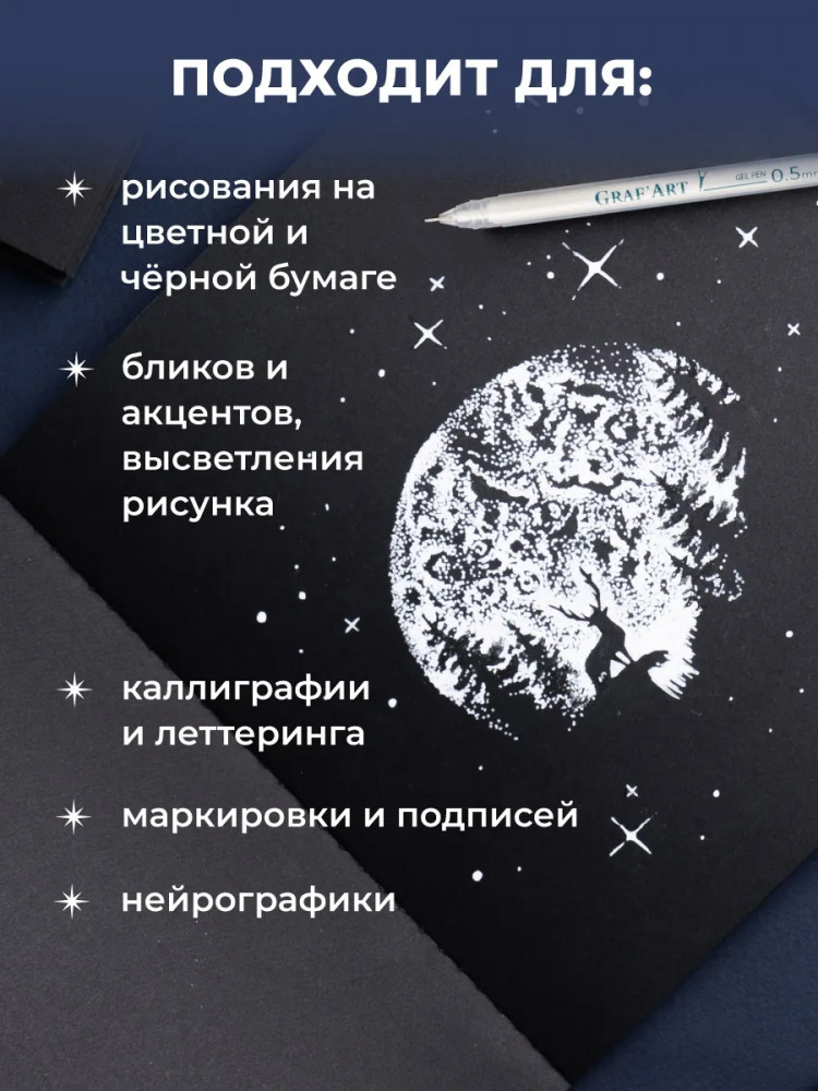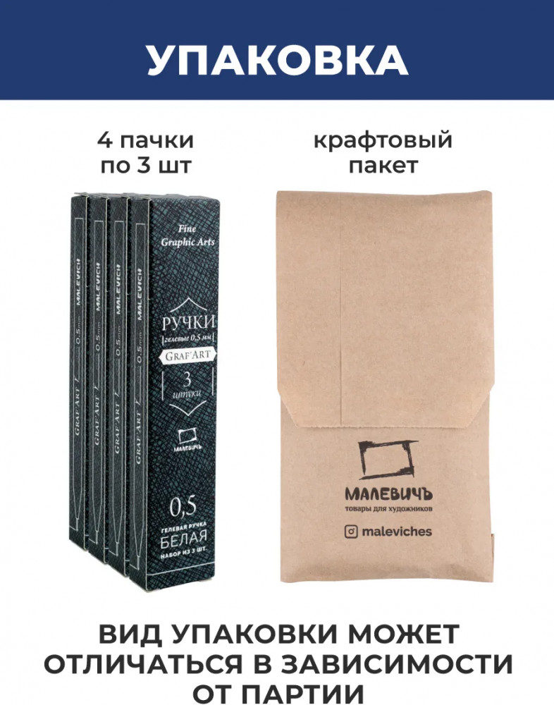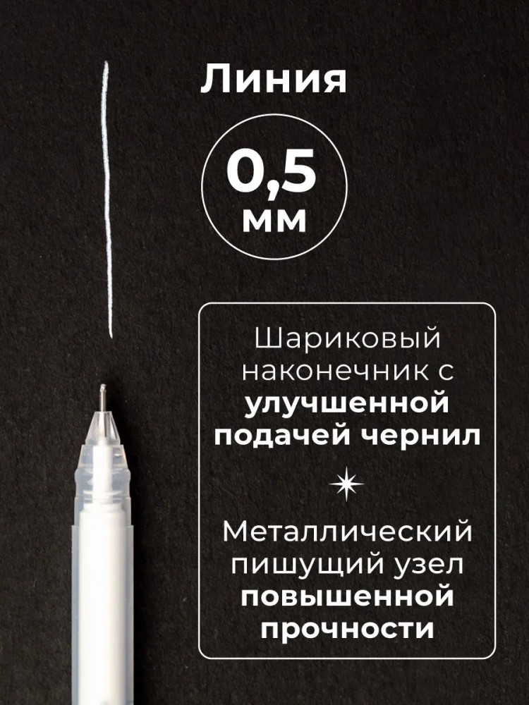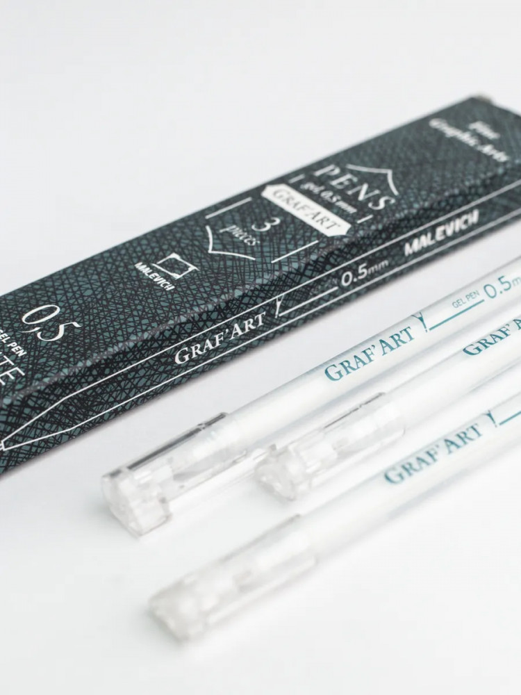 Белая гелевая ручка с тонким и прочным пишущим узлом толщиной 0,5 мм из металла, с белыми чернилами. Используется в акварельном и маркерном скетчинге для того, чтобы подчеркнуть детали и свет. Белая гелевая ручка Малевичъ отлично подходит для рисования на черной бумаге. Утолщенный пишущий узел с улучшенной подачей чернил удобен в использовании. Линия толщиной 0,5 мм. Подходит для рисования на цветной и темной бумаге, в качестве письменной принадлежности, а также для каллиграфии. Ручка Малевич может использоваться для высветления ранее нанесенного рисунка или для бликов на рисунке. Обладает высокой укрывистостью, почти не просвечивает.