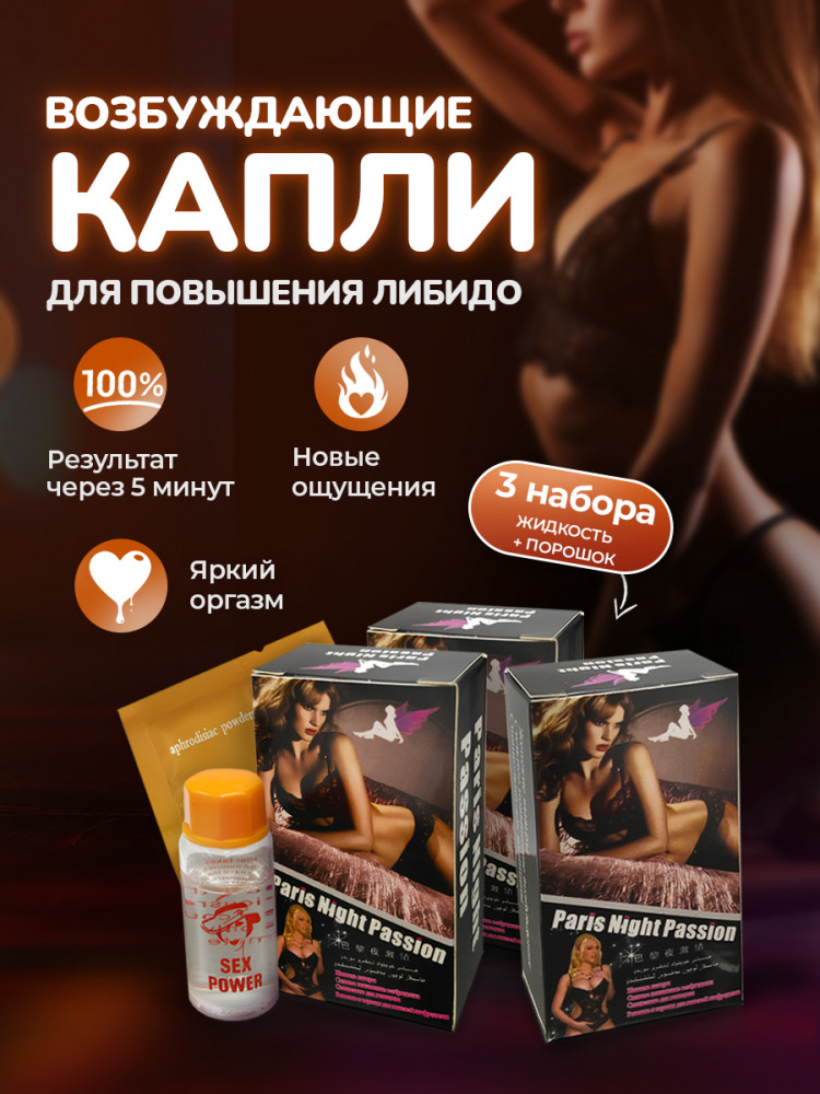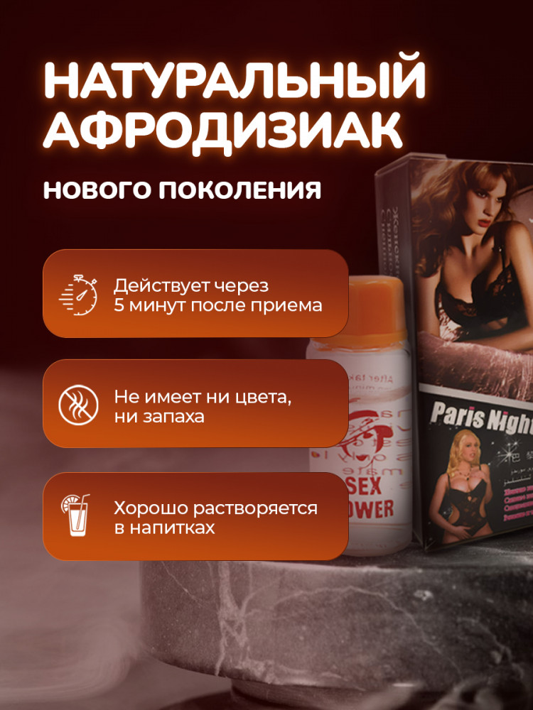 Paris Night Passion — быстродействующие возбуждающие капли для женщин, созданные для тех, кто хочет вернуть или усилить сексуальное влечение, повысить чувствительность эрогенных зон и сделать интимную жизнь ярче. Средство даёт быстрый эффект: заметное возбуждение и прилив ощущений уже через 5 минут после приёма и продолжает поддерживать эффект до 24 часов, что делает капли удобным решением как для экстренного возбуждения перед близостью, так и для романтического вечера без спешки. Капли усиливают естественную смазку, уменьшают нервное напряжение, повышают частоту и качество оргазмов, способствуют большей раскрепощённости и доверительности в паре — всё это в сочетании с натуральными афродизиаками из растительных и традиционных рецептур. Paris Night Passion подходит женщинам с пониженным либидо, при сниженной чувствительности или фригидности, при климактерических изменениях и хронической усталости, а также парам, которые хотят добавить новизны в сексуальные практики. Paris Night Passion — это про естественную чувственность, больше удовольствия и уверенность в себе: усиливает кровообращение в малом тазу, повышает чувствительность, улучшает прелюдию и делает оргазмы ярче и чаще.