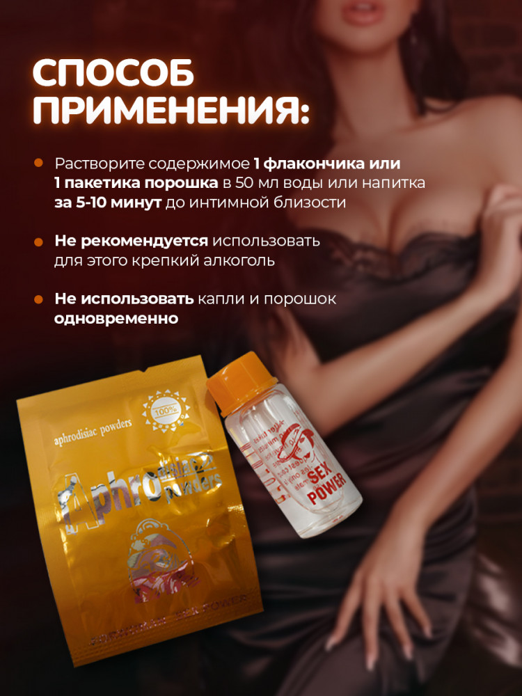 Способ применения: растворить содержимое 1 флакончика или 1 пакетика в 50 мл воды или напитка за 5–10 минут до интимной близости; не рекомендуется растворять в крепком алкоголе; не принимать более 1 флакончика/пакетика в течение 24 часов.