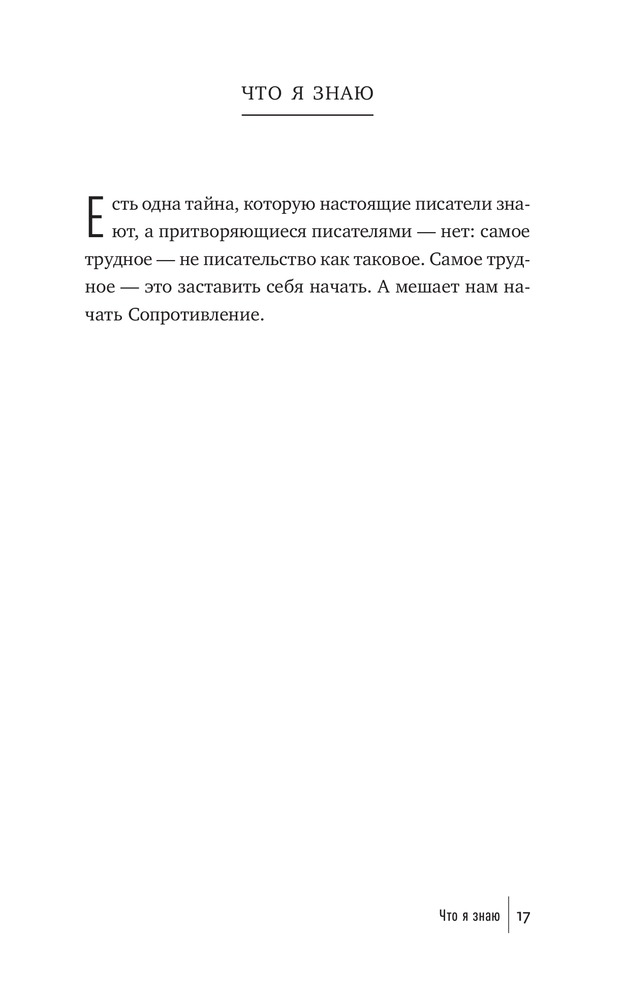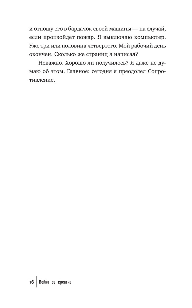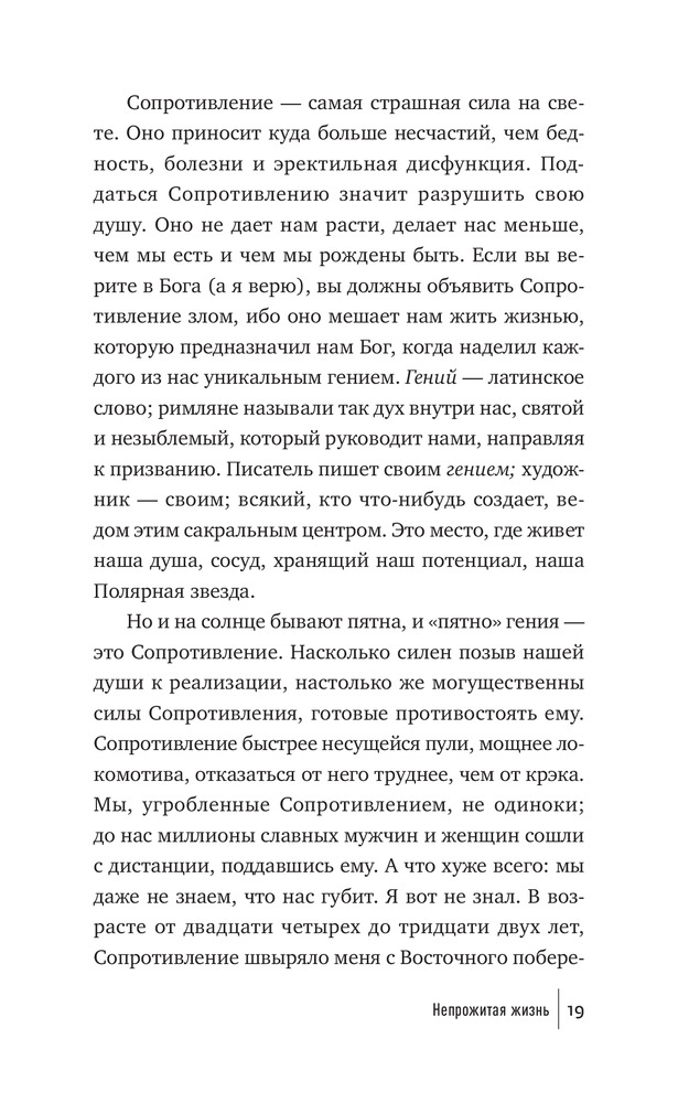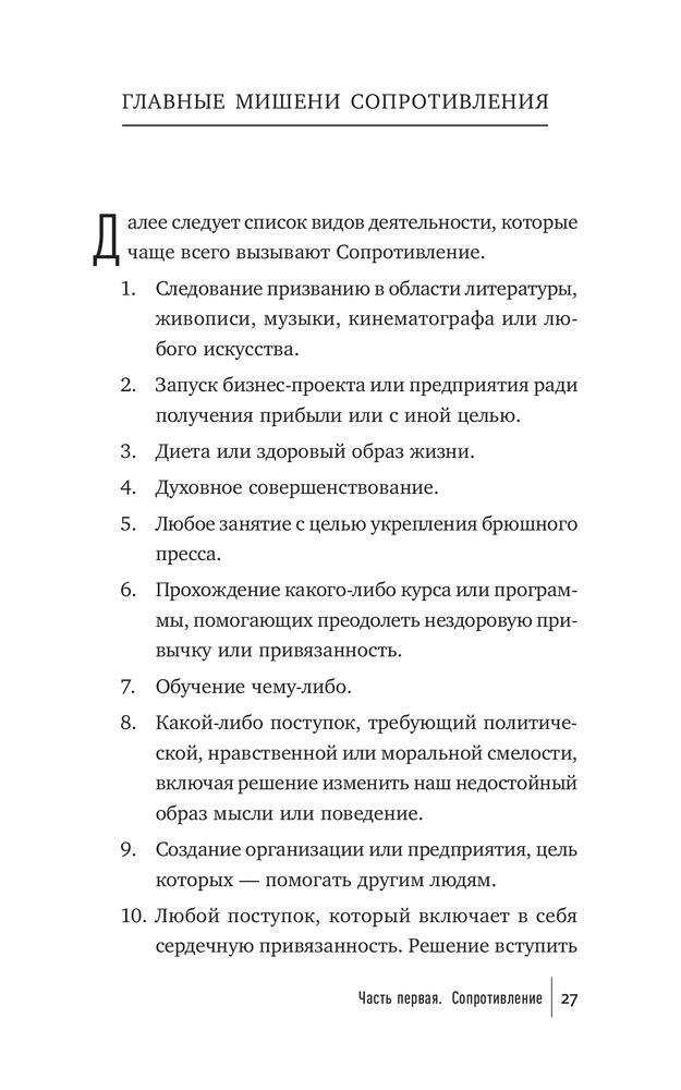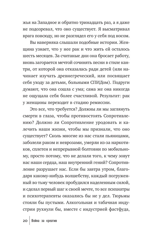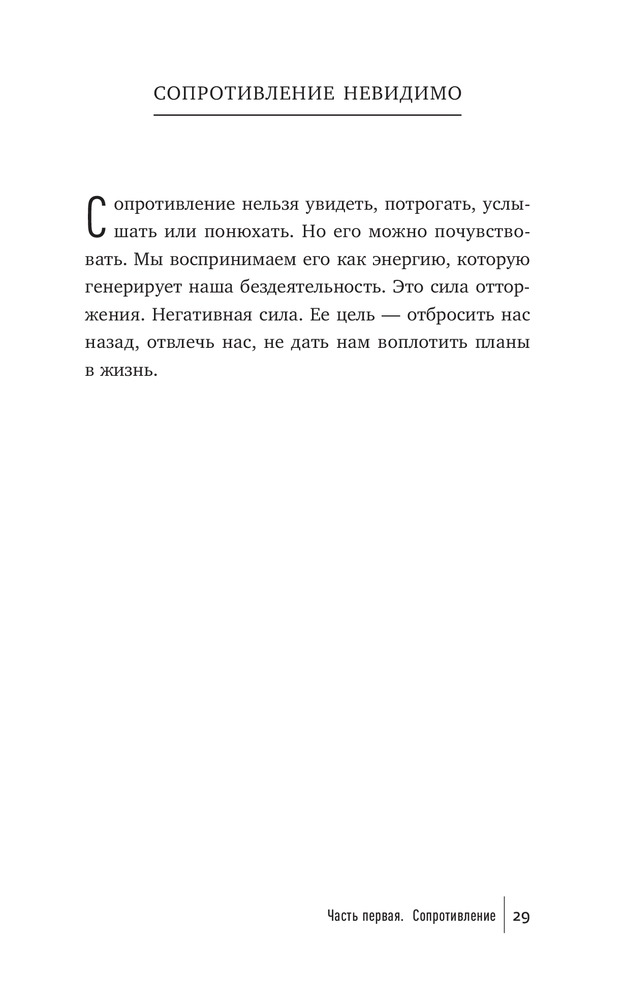 Что мешает художнику написать картину, писателю — создать роман, режиссеру — сиять фильм, ученому — закончить монографию? Что мешает нам перестать искать для себя оправдания и наконец-то начать заниматься спортом и правильно питаться, выучить иностранный язык, получить водительские права? Внутреннее Сопротивление. Его голос маскируется под голос разума. Оно обманывает нас, пускается на любые уловки, лишь бы уговорить нас не браться за дело и отложить его на какое-то время (пока не будешь лучше себя чувствовать, пока не разберешься с «накопившимися делами» и прочее в таком духе). Сопротивление сковывает нас и постепенно разрушает наши жизни.