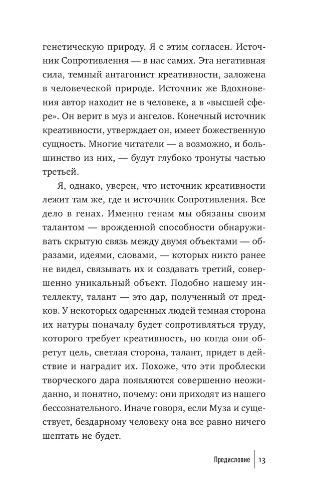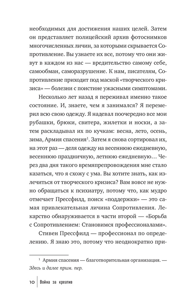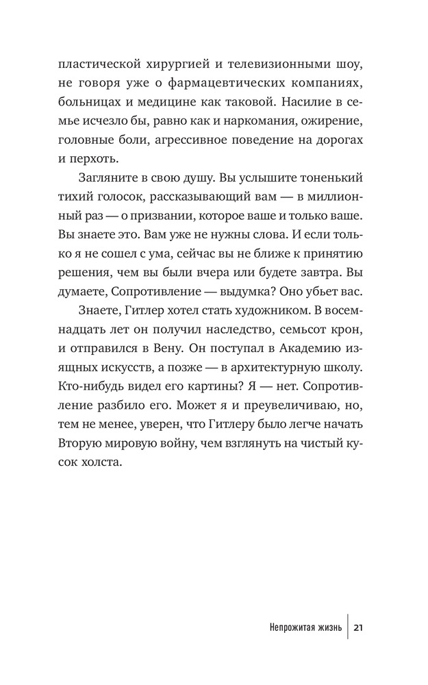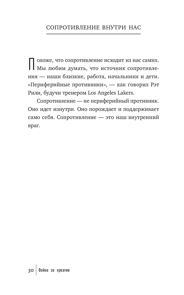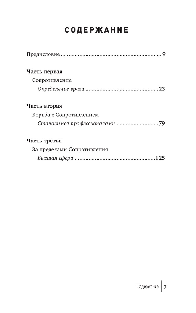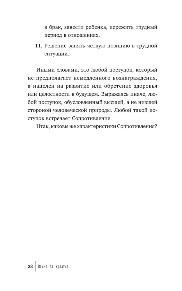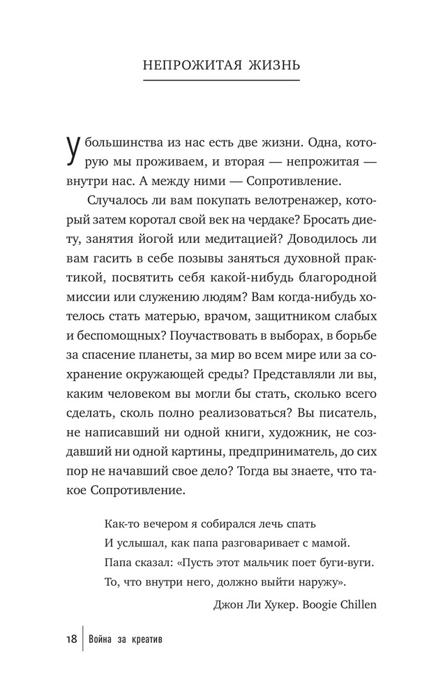 Что мешает художнику написать картину, писателю — создать роман, режиссеру — сиять фильм, ученому — закончить монографию? Что мешает нам перестать искать для себя оправдания и наконец-то начать заниматься спортом и правильно питаться, выучить иностранный язык, получить водительские права? Внутреннее Сопротивление. Его голос маскируется под голос разума. Оно обманывает нас, пускается на любые уловки, лишь бы уговорить нас не браться за дело и отложить его на какое-то время (пока не будешь лучше себя чувствовать, пока не разберешься с «накопившимися делами» и прочее в таком духе). Сопротивление сковывает нас и постепенно разрушает наши жизни.