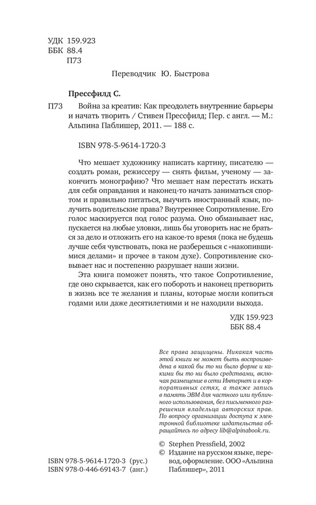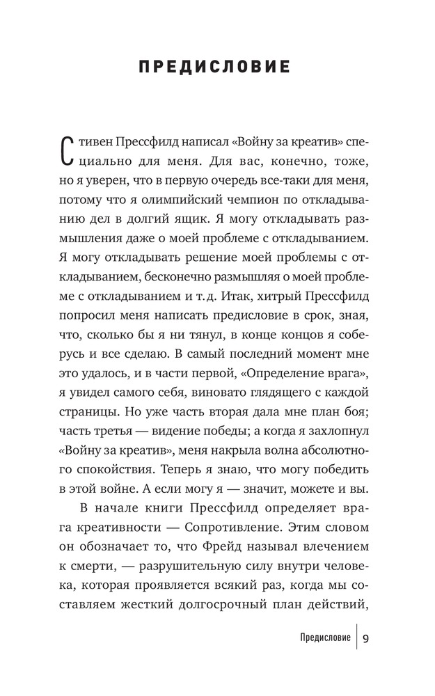Очень классная книга. Читала её в электронном виде. Написано интересно. Идея книги — "Сопротивление" — ваш хитрый и коварный враг. Могу сказать, что с таким подходом к проблеме прокрастинации книга работает! Я рада что прочитала её. Закажу книжную версию, мы склонны забывать о том, что мы уже знаем.