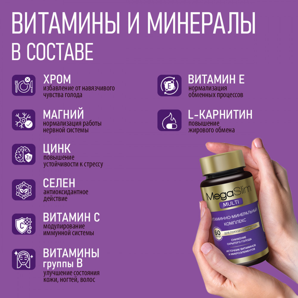 💳 Оплатить за товар можно при получении 🇰🇿 Есть бесплатная доставка по Казахстану от 1 дня 🎁 Копите бонусы с каждой покупки Серия: MegaSlim MULTI MegaSlim — восполнение витаминов и минералов. MULTI MegaSlim — это специально разработанный витаминно-минеральный комплекс для женщин и для мужчин. Во время похудения организм может испытывать дефицит витаминов и минералов, так называемый «скрытый голод», что может замедлить обмен веществ и снизить эффективность диеты. Компоненты комплекса MULTI MegaSlim помогают восполнить дефицит полезных веществ в организме в целом, в том числе оказывая положительный эффект для кожи, для волос и для ногтей. |