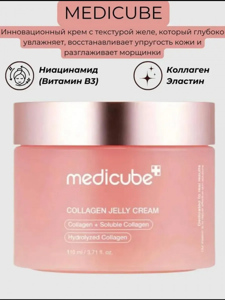Крем-гель medicube Collagen Jelly Cream восполняет недостаток влаги, стимулирует внутренние процессы восстановления, делает кожу сияющей, упругой и гладкой. Ускоряет заживление микроповреждений, препятствует появлению морщин и замедляет старение. Выравнивает тон, придаёт сияние с эффектом glass skin. Невесомая гелевая текстура подходит для использования с аппаратами medicube. Не содержит силиконов и искусственных красителей — розовый цвет продукту придаёт витамин B12. Уровень pH 5.69–7.69.