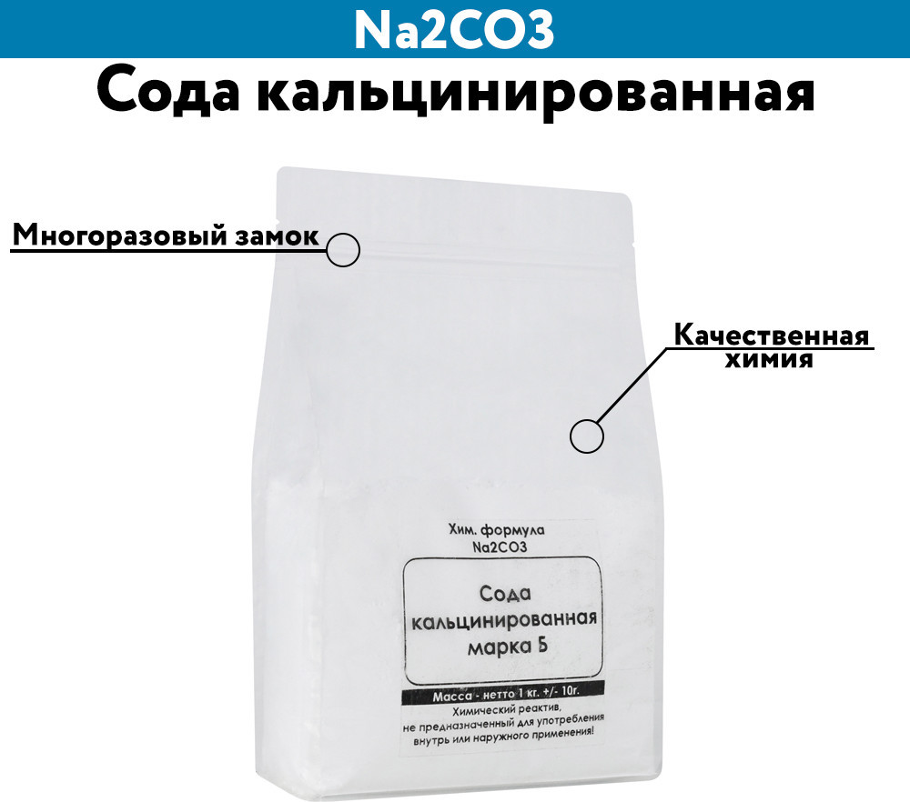Сода кальцинированная — это белый кристаллический порошок, хорошо растворяется в воде. Кальцинированная сода может раздражать кожу и слизистые. Работать желательно в перчатках и избегать попадания пыли в глаза. Качественная химия в удобной упаковке с многоразовым замком. |