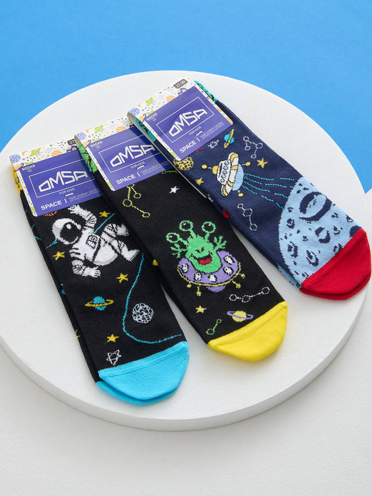 Носки детские для мальчиков Calzino 23P80 от Omsa Kids с разнообразными космическими принтами. В составе — высококачественный хлопок, который позволяет коже дышать, отлично впитывает влагу, приятно ощущается на теле и подходит даже для нежной и чувствительной кожи. Удобная резинка обеспечивает идеальное облегание, а кеттельный (плоский) шов на мыске создает дополнительный комфорт. Обладают повышенной износостойкостью, сохраняют форму и насыщенность цвета после стирок. Соответствуют гигиеническим требованиям для детской продукции. Красочные и яркие носки, которые наверняка понравятся юным исследователям космоса. Целая серия рисунков с космонавтами, инопланетянами, космическими кораблями и планетами точно не оставит ребенка равнодушным — носки станут прекрасным подарком на любой праздник. Продукция Omsa Kids создана с заботой и любовью к детям.