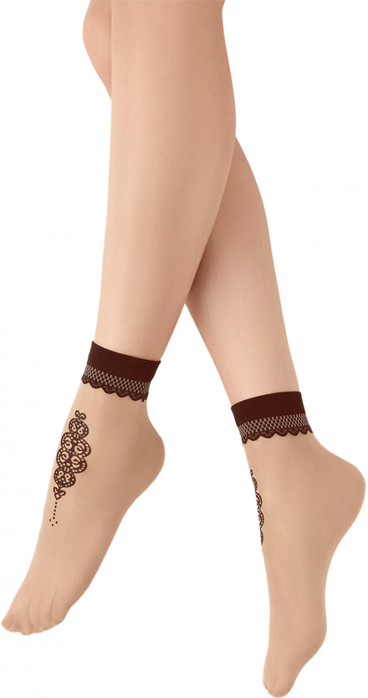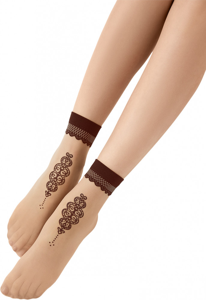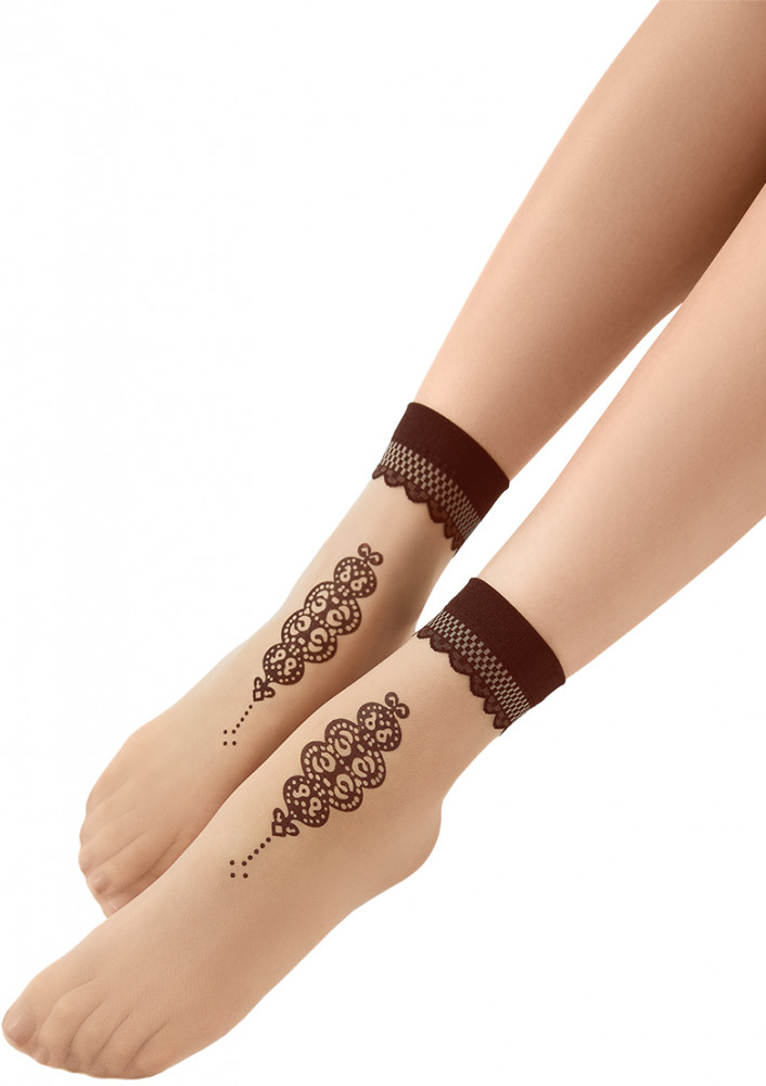 Женские фантазийные носки с принтом в стиле мехенди. Превосходно облегают и комфортно ощущаются в течение всего дня благодаря эластану в составе и удобной резинке. Оригинальный принт выглядит как роспись хной на обнаженной коже, а фантазийная резинка с ажурными декоративными элементами создает единый ансамбль с рисунком. Тонкие носки с необычным орнаментом — это самобытный и необычный аксессуар, который кардинально преобразит любой наряд.