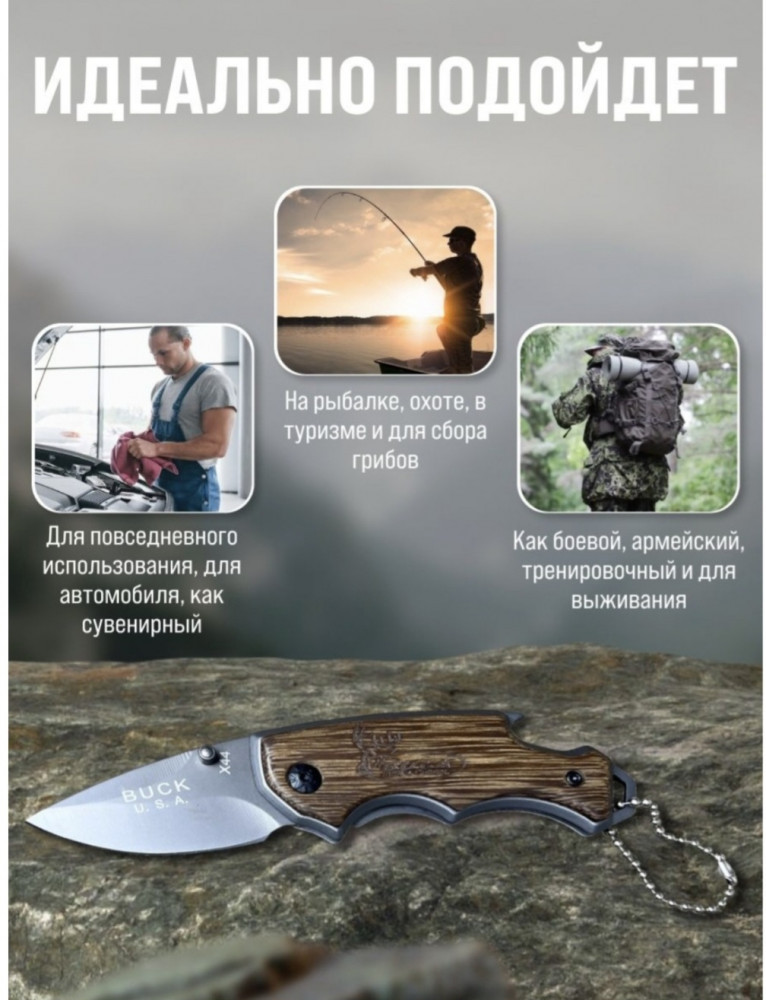 Нож складной без автоматического открывания «Buck Х44»острый клинок компактный размер нет замка неавтоматическое открытие шпенек В данный момент этот товар отсутствует в продаже. Возможно, у нас найдется аналогичный или похожий товар здесь. Складной нож Buck Х44 — надежный помощник для выживания, рыбалки и грибных походов. Этот нож сочетает в себе высокое качество материалов и эргономичный дизайн, что делает его идеальным выбором для активного отдыха. |