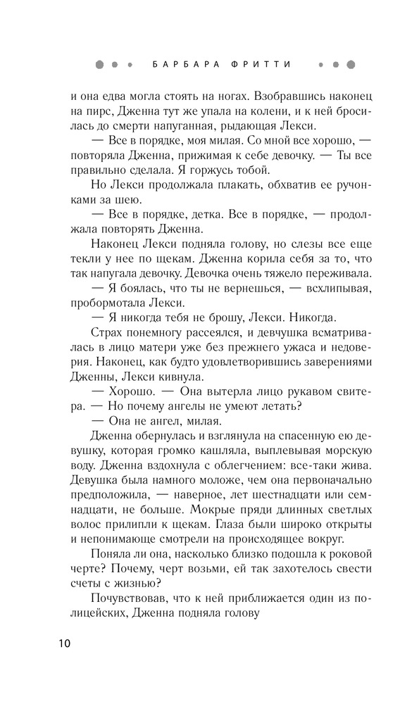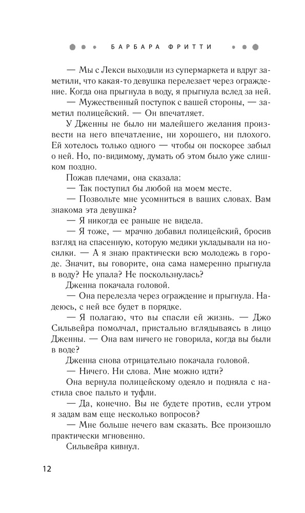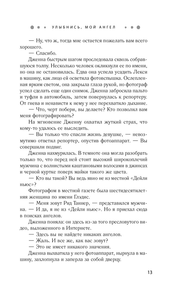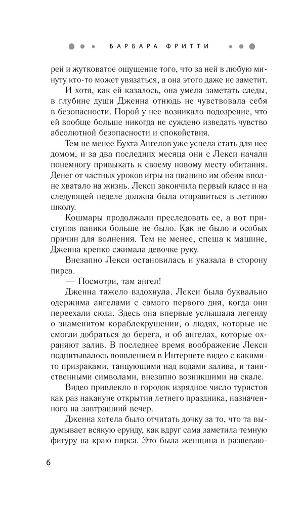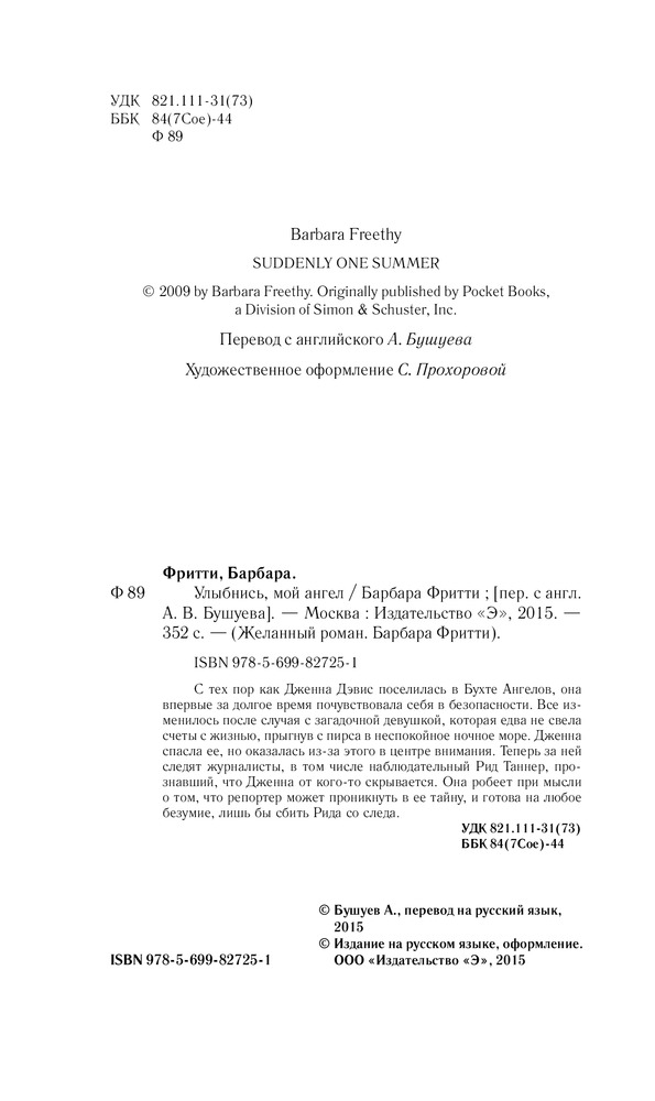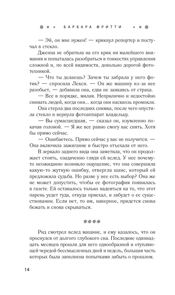 В данный момент этот товар отсутствует в продаже. Возможно, у нас найдется аналогичный или похожий товар здесь. Серия: Желанный роман. Барбара Фритти С тех пор как Дженна Дэвис поселилась в Бухте Ангелов, она впервые за долгое время почувствовала себя в безопасности. Все изменилось после случая с загадочной девушкой, которая едва не свела счеты с жизнью, прыгнув с пирса в неспокойное ночное море. Дженна спасла ее, но оказалась из-за этого в центре внимания. Теперь за ней следят журналисты, в том числе наблюдательный Рид Таннер, прознавший, что Дженна от кого-то скрывается. Она робеет при мысли о том, что репортер может проникнуть в ее тайну, и готова на любое безумие, лишь бы сбить Рида со следа. |