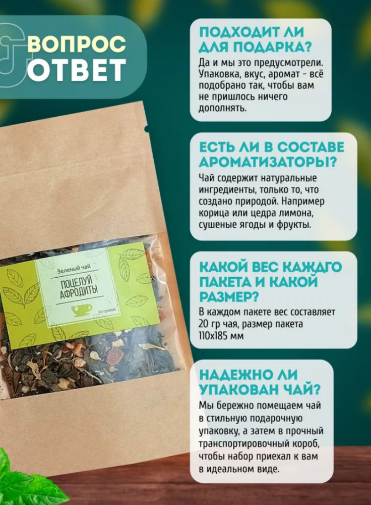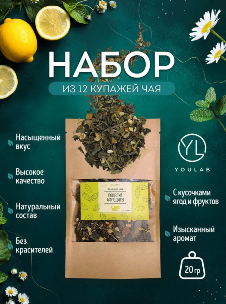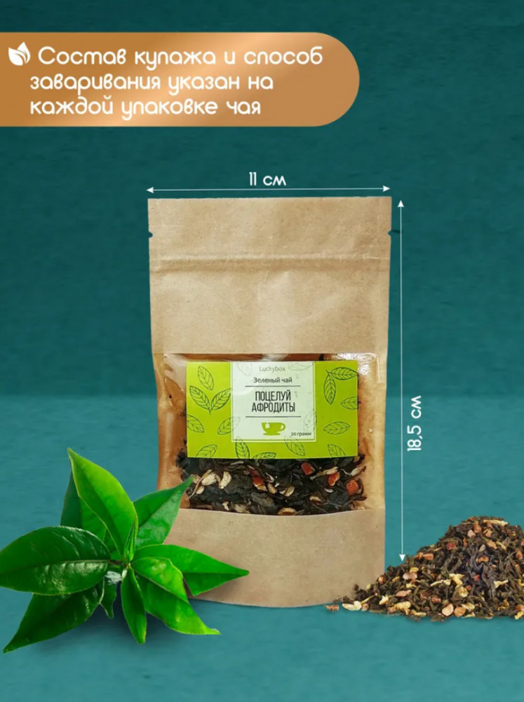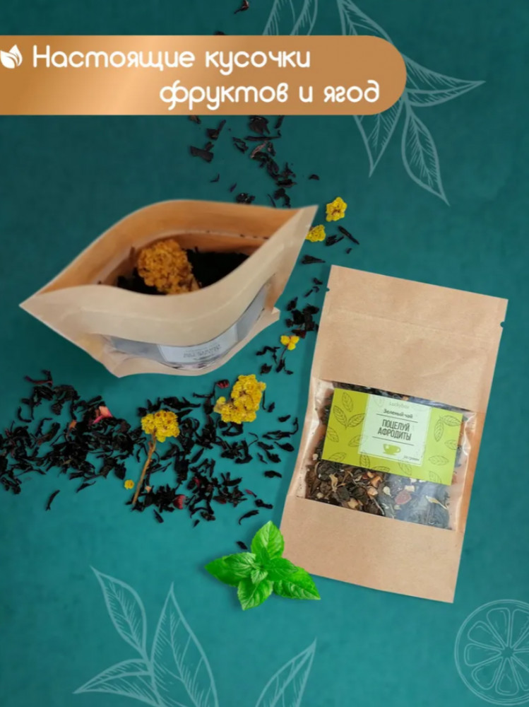 Поцелуй Афродиты: зеленый чай, белый чай, бутоны жасмина, лепестки календулы и сафлора, цедра лимона.