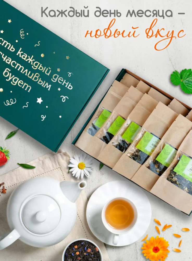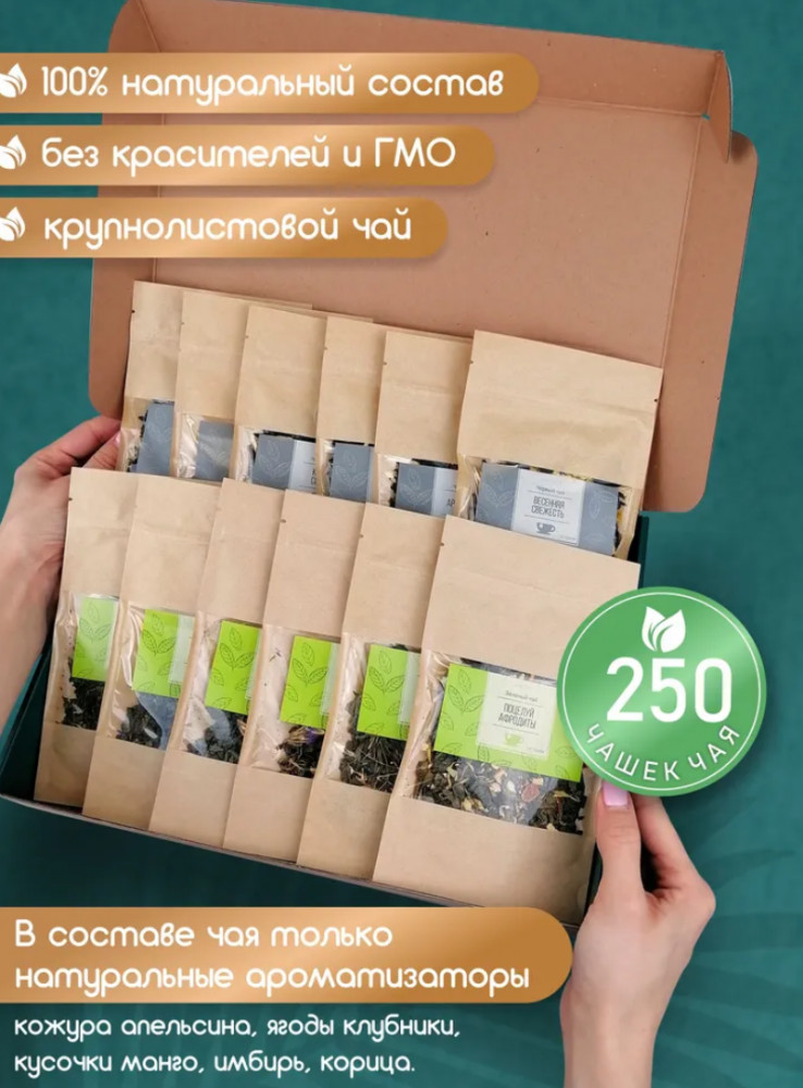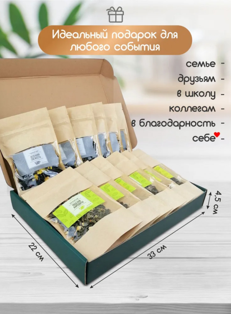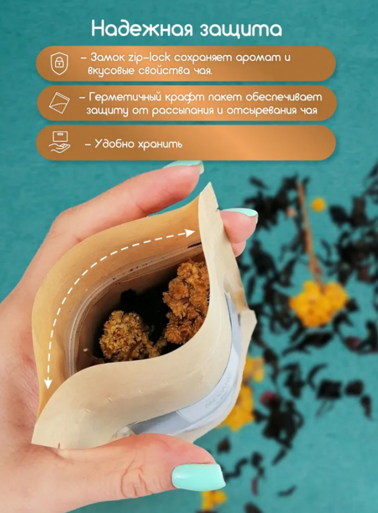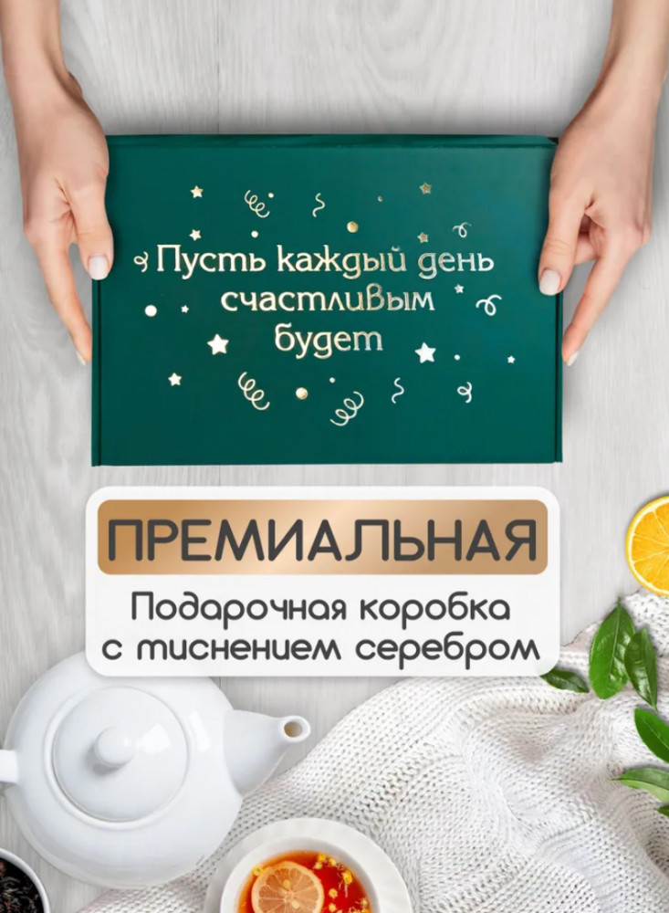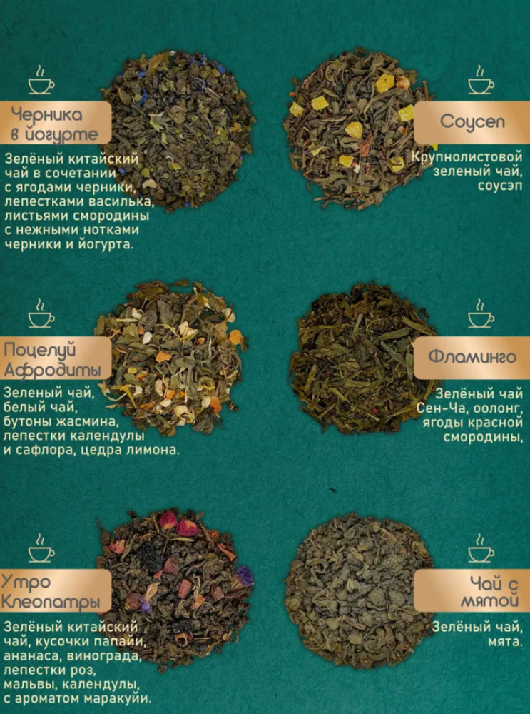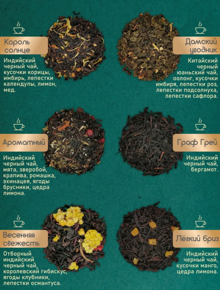 Ароматный: индийский черный чай, мята, зверобой, крапива, ромашка, эхинацея, ягоды брусники, цедра лимона.