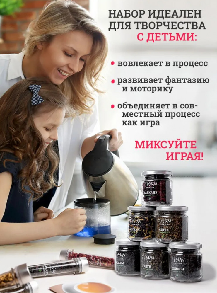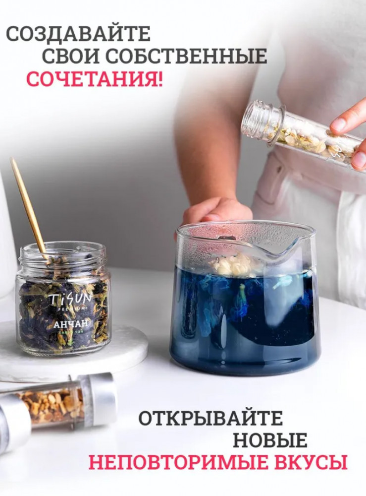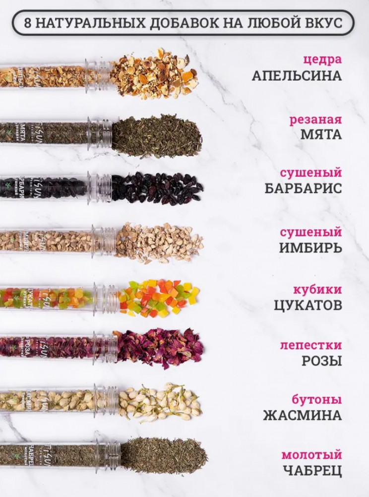 Что входит в набор чая TiSun: он включает шесть стеклянных банок объемом 200 мл, каждая из которых наполнена великолепными чайными смесями. В нем вы найдете классические зеленые и черные чаи, такие как чай зеленый листовой и крупнолистовой черный чай, а также уникальные варианты, включая анчан, каркаде, улун. Дополняют его восемь пробирок высотой 13 см с разнообразными добавками, они позволяют создавать как классические, так и совершенно новые, собственные купажи, варьируя вкус и аромат напитков.