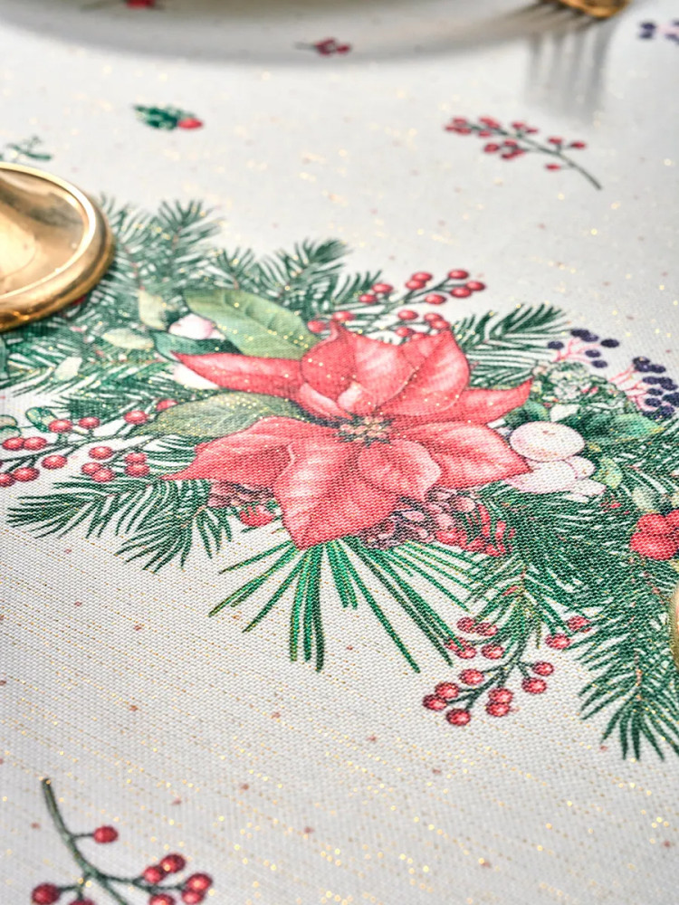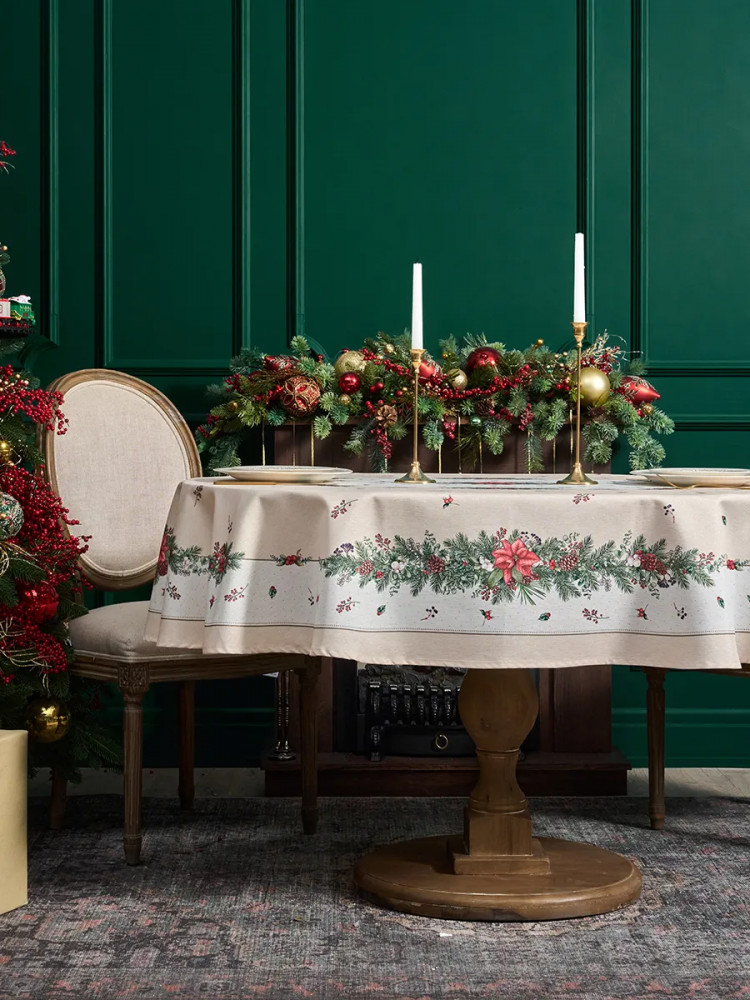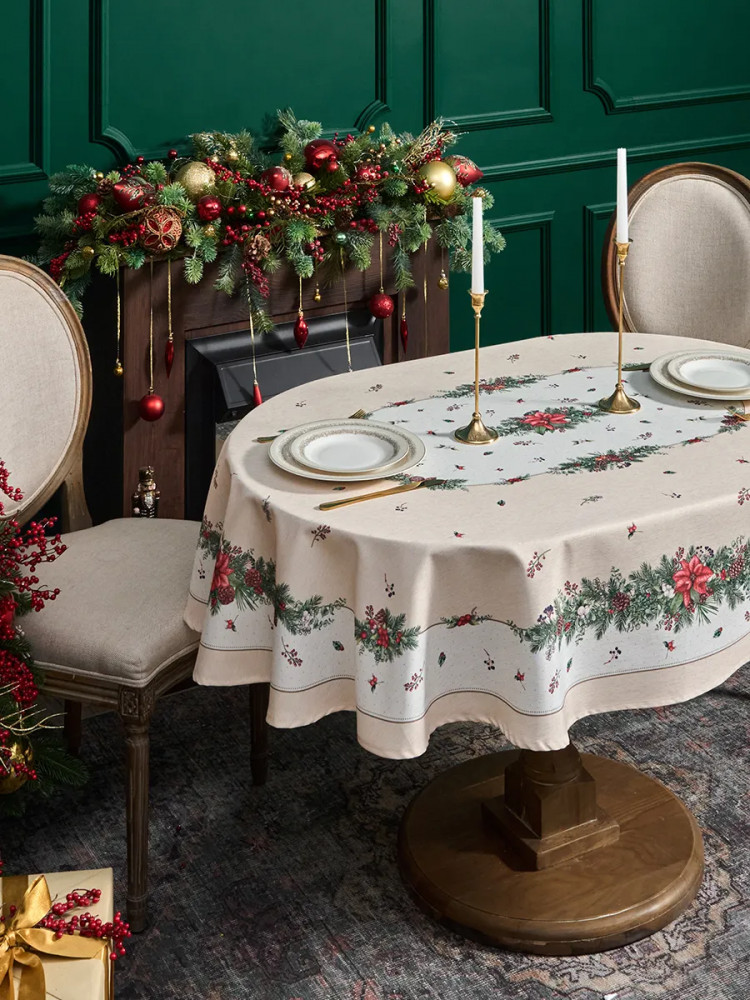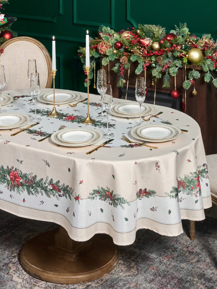 Новогодняя овальная скатерть Lefard из коллекции «Celebration» — элегантное украшение стола и изысканный акцент зимнего интерьера. Она создаёт атмосферу тепла, уюта и ожидания праздника, превращая ужин в красивую семейную традицию. Принт вдохновлён мотивами зимнего леса: еловая зелень, алые ягоды и шишки образуют композицию, напоминающую рождественский венок. Ткань словно хранит свежесть зимнего утра и праздничное настроение.