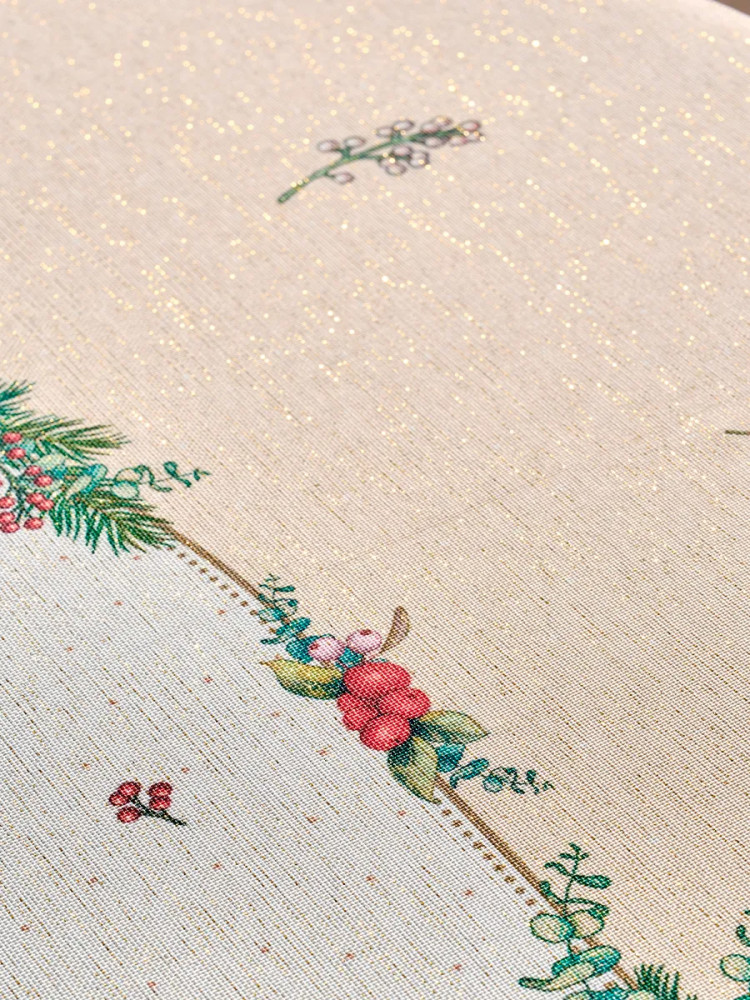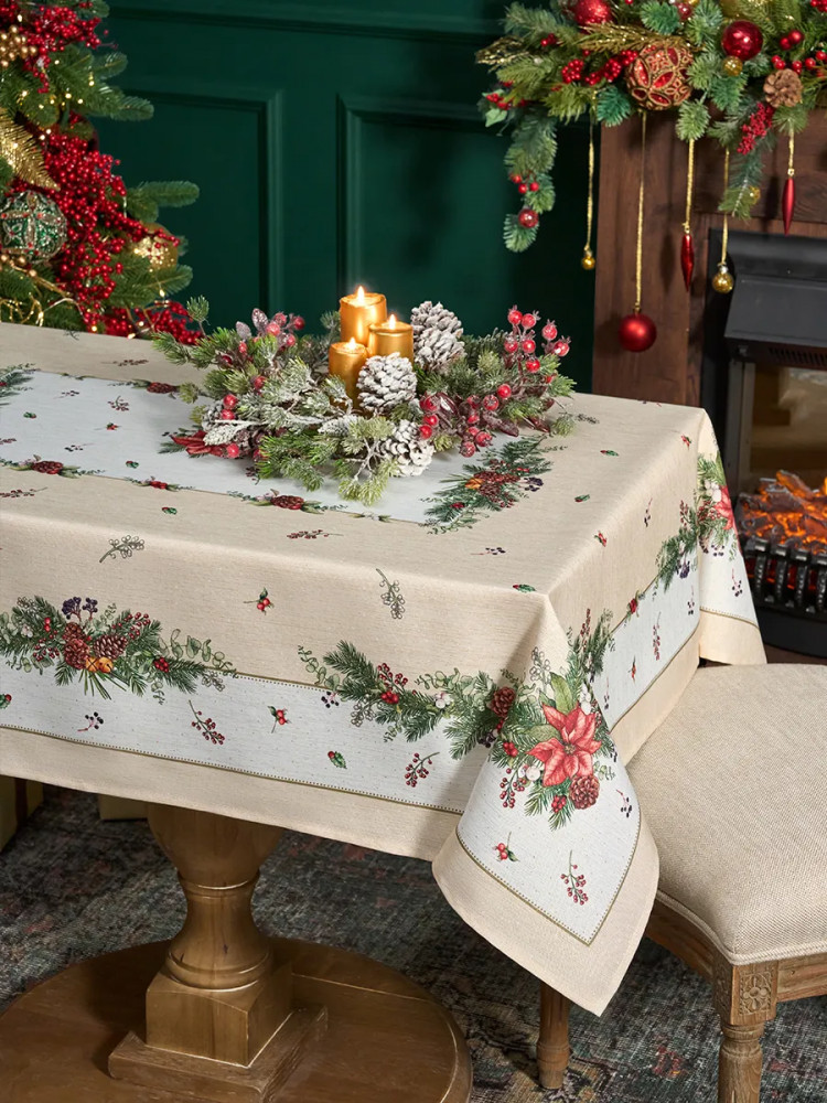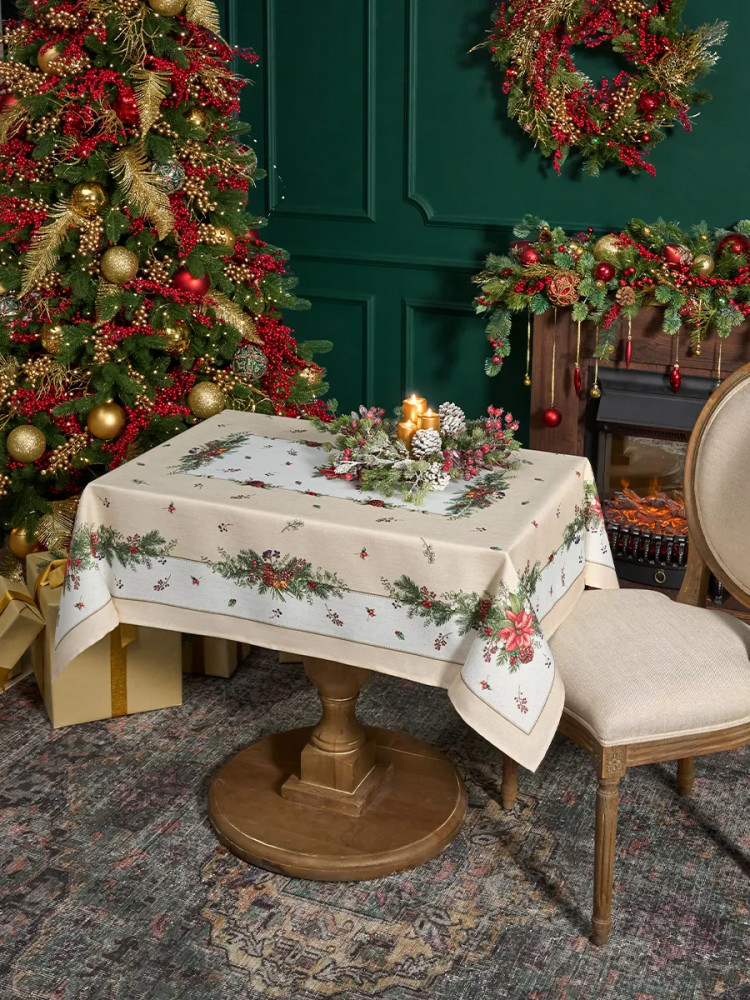 Новогодняя прямоугольная скатерть Lefard из коллекции «Celebration» — элегантное украшение стола и изысканный акцент зимнего интерьера. Она создаёт атмосферу тепла, уюта и ожидания праздника, превращая ужин в красивую семейную традицию. Принт вдохновлён мотивами зимнего леса: еловая зелень, алые ягоды и шишки образуют композицию, напоминающую рождественский венок. Ткань словно хранит свежесть зимнего утра и праздничное настроение.