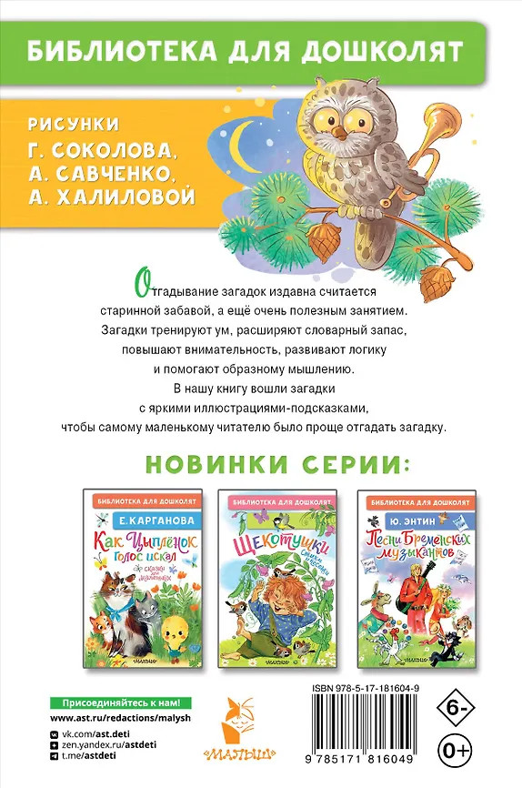 💳 Оплатить за товар можно при получении 🇰🇿 Есть бесплатная доставка по Казахстану 🎁 Копите бонусы с каждой покупки Серия: Библиотека для дошколят Загадки играют важную роль в образовании и творческом развитии детей. Это не только увлекательная игра, это ещё и выражение народной мудрости. В эту книгу вошли русские народные загадки и авторские — М. Дружининой и Е. Каргановой. К каждой загадке художники нарисовали рисунки-подсказки, чтобы малышу было проще отгадывать. Рисунки А. Савченко, Г. Соколова и А. Халиловой. Для дошкольного возраста. |