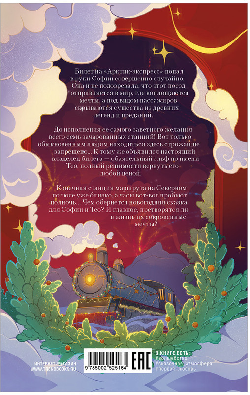 💳 Оплатить за товар можно при получении 🇰🇿 Есть бесплатная доставка по Казахстану от 1 дня 🎁 Копите бонусы с каждой покупки Билет на «Арктик-экспресс» попал в руки Софии совершенно случайно. Она и не подозревала, что этот поезд отправляется в мир, где воплощаются мечты, а под видом пассажиров скрываются существа из древних легенд и преданий. До исполнения ее самого заветного желания всего семь зачарованных станций! Вот только обыкновенным людям находиться здесь строжайше запрещено... К тому же объявился настоящий владелец билета — обаятельный эльф по имени Тео, полный решимости вернуть его любой ценой. Конечная станция маршрута на Северном полюсе уже близко, а часы вот-вот пробьют полночь... Чем обернется новогодняя сказка для Софии и Тео? И главное, претворятся ли в жизнь их сокровенные мечты? |