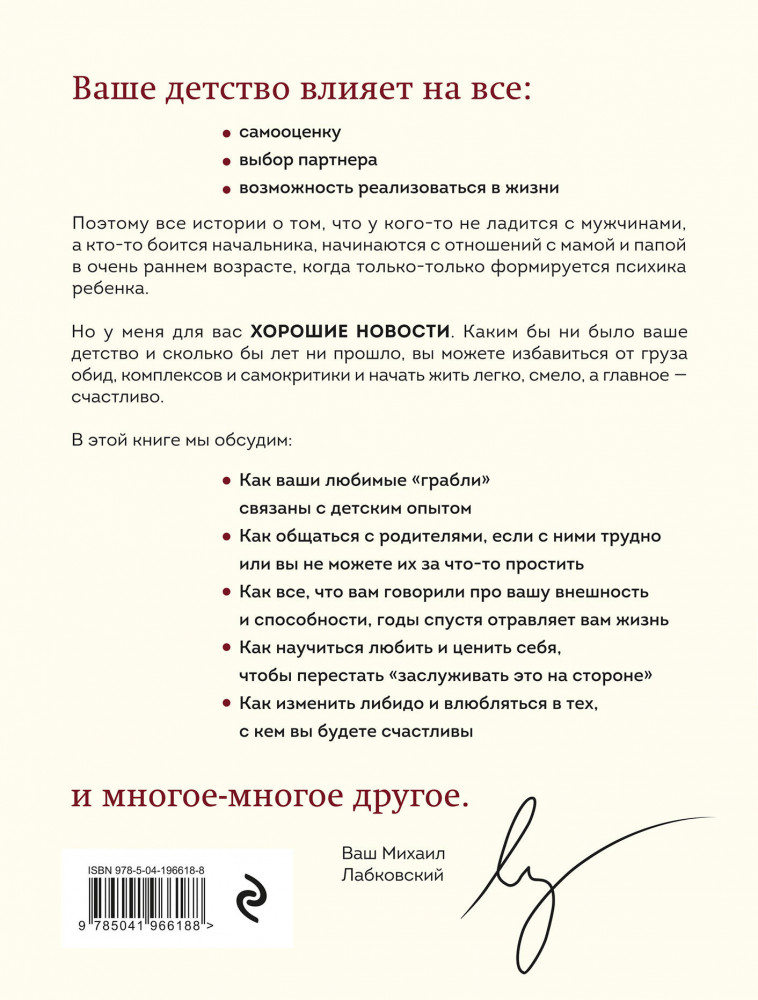 Психолог Михаил Лабковский абсолютно уверен: чтобы изменить сценарий, по которому вы живете, нужно вернуться в детство и понять, почему родители так себя вели. Осознать, что мама и папа были холодны, потому что их самих недолюбили и любить они так и не научились. Агрессивны — из-за своих проблем с психикой. Критиковали, потому что сами в себя не верили, а значит, не верили и в вас. И вы тут ни при чем.
