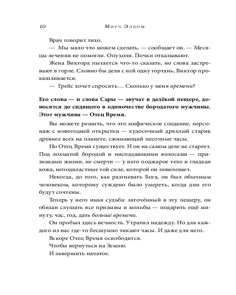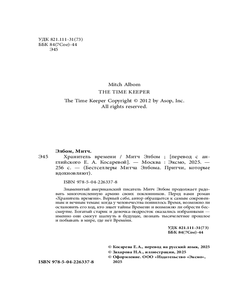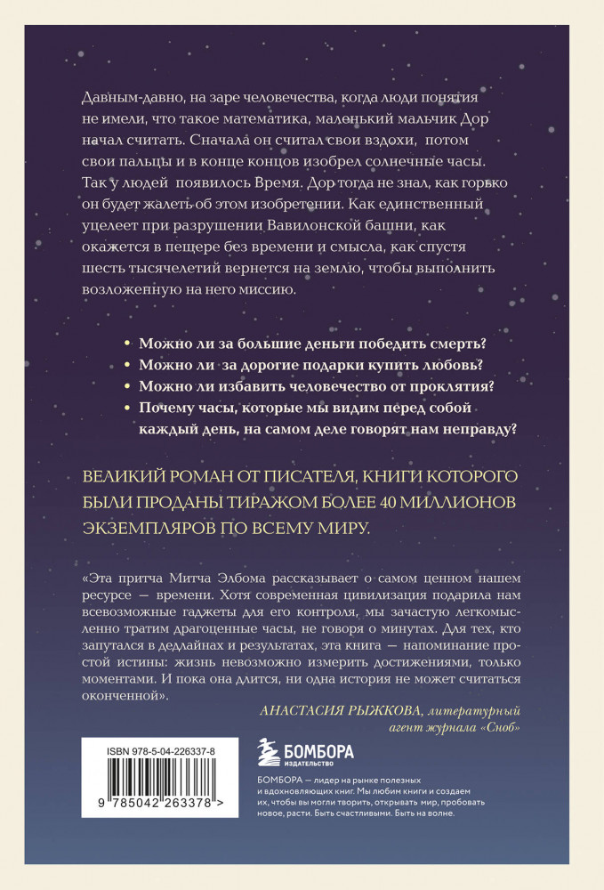 💳 Оплатить за товар можно при получении 🇰🇿 Есть бесплатная доставка по Казахстану 🎁 Копите бонусы с каждой покупки Серия: Бестселлеры Митча Элбома. Притчи, которые вдохновляют Давным-давно, на заре человечества, когда люди понятия не имели, что такое математика, маленький мальчик Дор начал считать. Сначала он считал свои вздохи, потом свои пальцы и в конце концов изобрел солнечные часы. Так у людей появилось Время. Дор тогда не знал, как горько он будет жалеть об этом изобретении. Как единственный уцелеет при разрушении Вавилонской башни, как окажется в пещере без времени и смысла, как спустя шесть тысячелетий вернется на Землю, чтобы выполнить возложенную на него миссию. Дору предстоит познакомиться со старшеклассницей Сарой Лемон и 82-летним миллионером Виктором Деламонтом, которым предначертано узнать секреты Времени, постичь тайны бессмертия и осознать, для чего же человеческая жизнь имеет свое начало и конец. |