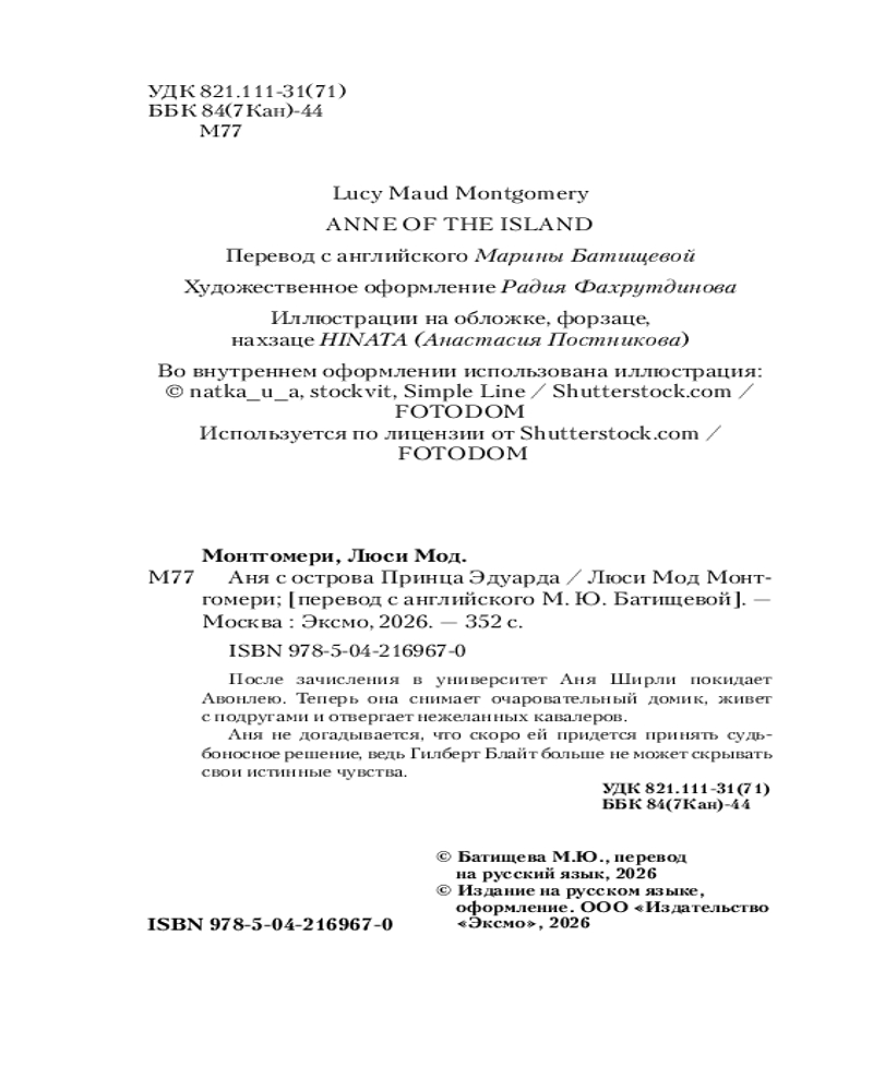 💳 Оплатить за товар можно при получении 🇰🇿 Есть бесплатная доставка по Казахстану 🎁 Копите бонусы с каждой покупки Серия: Young Adult. Согревающая классика Став студенткой, Аня Ширли уезжает в Кингспорт. В университете она находит новых подруг, открывает талант к писательству и ловит восхищенные взгляды. Любовь, что витала рядом, теперь проникает и в сердце Ани. Сможет ли она довериться чувствам и дать шанс другу детства? |