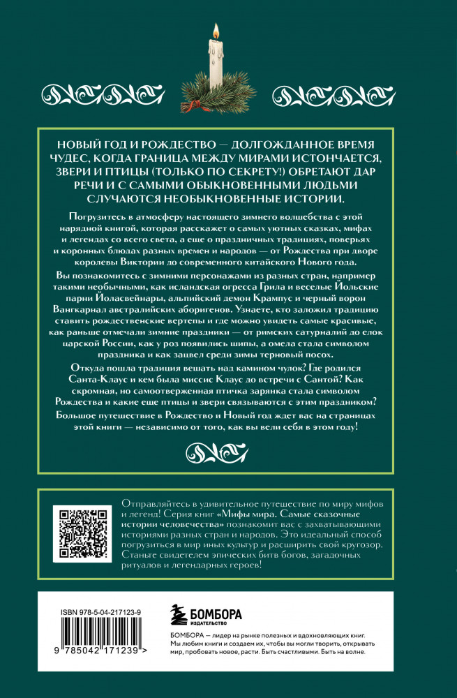 Серия: Мифы мира. Самые сказочные истории человечества Эта яркая книга — словно нарядная шкатулка зимних легенд, в которых причудливо переплетаются библейские предания, языческие обряды и народный фольклор. С ее помощью вы совершите большое праздничное путешествие сквозь время и пространство — от римских Сатурналий до викторианских елок, от средневековой Европы до современного Китая — и откроете удивительные истоки любимых рождественских и новогодних традиций.