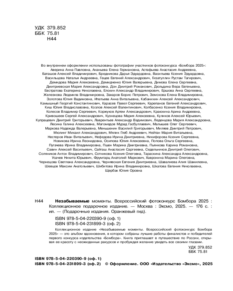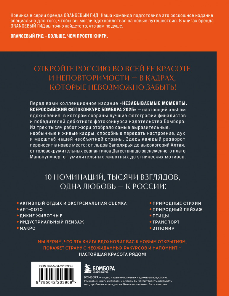 💳 Оплатить за товар можно при получении 🇰🇿 Есть бесплатная доставка по Казахстану 🎁 Копите бонусы с каждой покупки Серия: Подарочные издания. Оранжевый гид Откройте Россию — многогранную и бескрайнюю — в кадрах, которые невозможно забыть! Перед вами — коллекционное подарочное издание «Незабываемые моменты. Всероссийский фотоконкурс «Бомбора 2025» — настоящий альбом вдохновения и признания в любви к стране, где каждый снимок становится откровением. Из более чем трех тысяч заявок жюри выбрало лучшие из лучших — самые выразительные, эмоциональные и неожиданные фотографии, в которых оживает настроение, дух и масштаб России. |