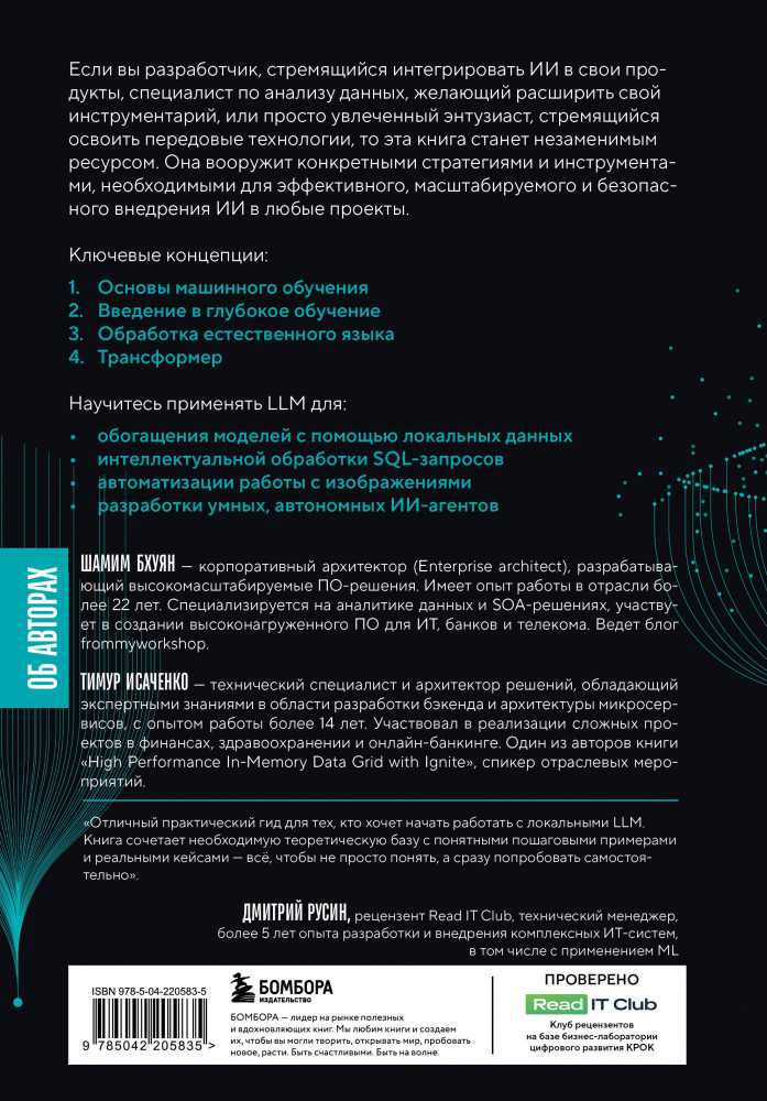 💳 Оплатить за товар можно при получении 🇰🇿 Есть бесплатная доставка по Казахстану 🎁 Копите бонусы с каждой покупки Серия: Путеводитель по GPT и AI Хотите создавать собственные ИИ-приложения, но вас пугает сложность технологий? Эта книга — практический гид для разработчиков, аналитиков данных и энтузиастов, которые только начинают свой путь в машинном обучении. Вы с нуля освоите ключевые концепции: от основ ML и глубокого обучения до архитектуры трансформеров, лежащей в основе современных LLM. |