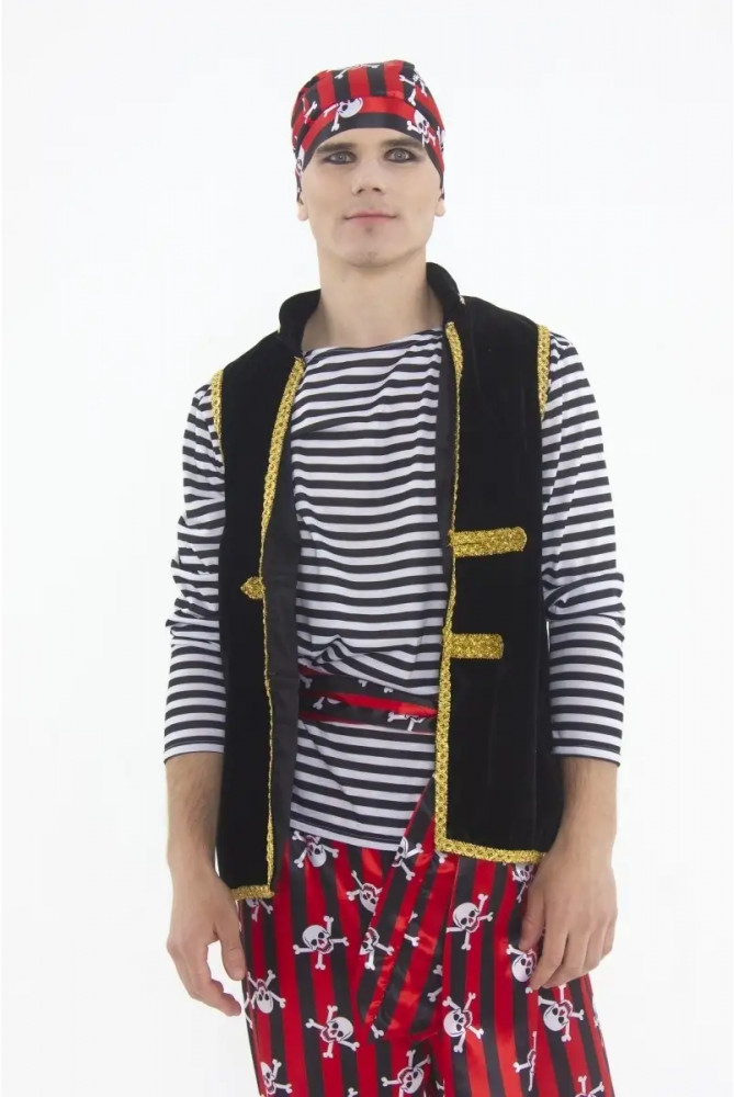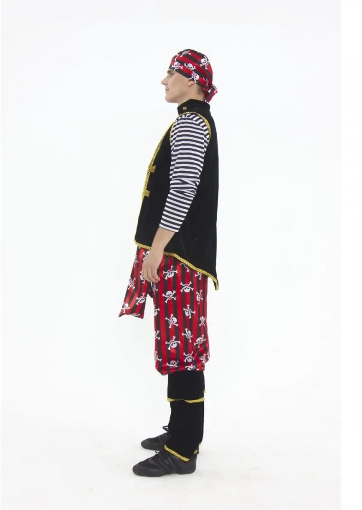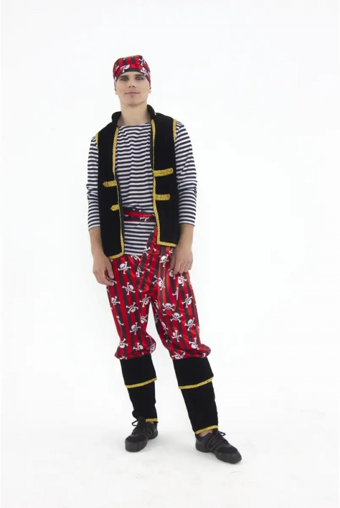 В комплект взрослого костюма пирата входят несколько элементов: тельняшка с длинным рукавом, прямые брюки с принтами черепов и имитацией сапог, а также яркая бандана и пояс в один цвет с брюками. Все элементы лучше надевать вместе, чтобы создать законченный броский образ, который легко сможет покорить любого.