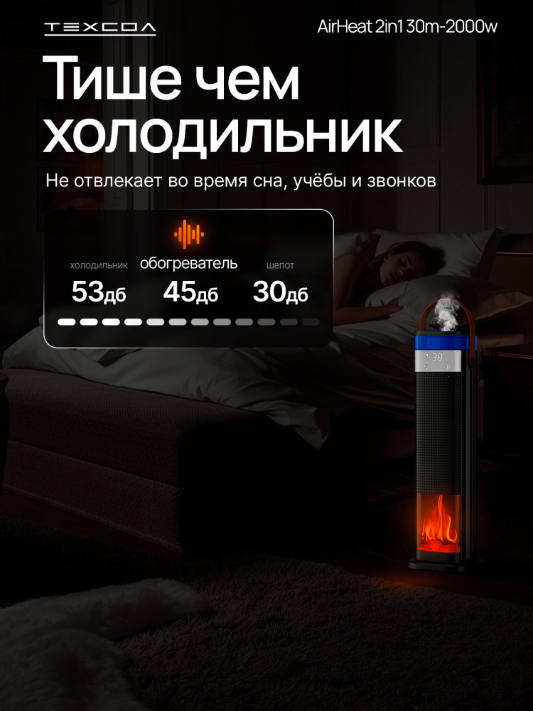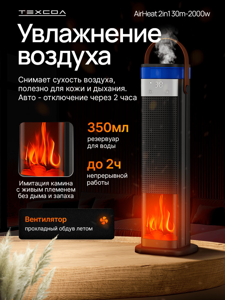 Тепловентилятор-увлажнитель AirHeat 2-в-1 имеет быстрый керамический обогрев и увлажнение воздуха, чтобы за минуты убрать прохладу и сухость. Регулируемая температура 15–40 °C, таймер, пульт и тихая работа помогают создать комфорт в спальне, гостиной или детской. Реалистичный 3D-эффект пламени и светящаяся панель добавляют уюта. Рекомендуемая площадь до 30 м².