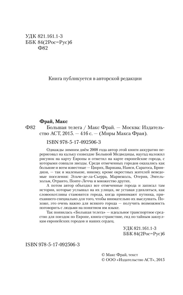 💳 Оплатить за товар можно при получении 🇰🇿 Есть бесплатная доставка по Казахстану от 1 дня 🎁 Копите бонусы с каждой покупки Серия: Миры Макса Фрая Однажды зимним днем 2008 года автор этой книги аккуратно перерисовал на кальку созвездие Большой Медведицы, наугад наложил рисунок на карту Европы и отметил на карте европейские города, с которыми совпали звезды. Среди отмеченных городов оказались как большие и всем известные — Цюрих, Варшава, Нанси, Сарагоса, Бриндизи, — так и маленькие, никому, кроме окрестных жителей неведомые поселения: Эльче- |