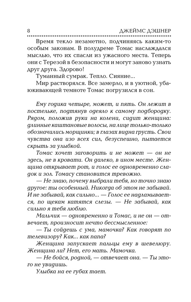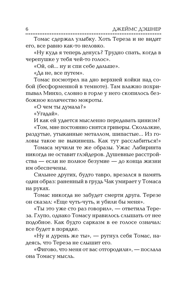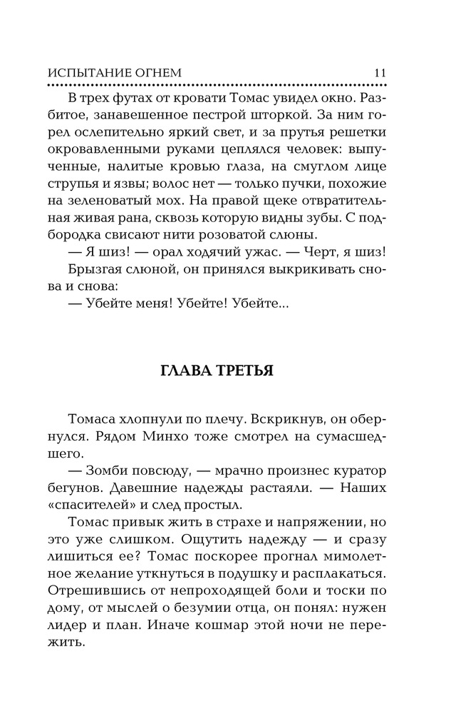 Я просто впустую потратила время. Книга ужасная. Если первую часть читаешь вроде как с каким-то интересом, то здесь чуть ли не на каждой странице останавливаешься, чтобы закатить глаза и вообще, задать вопрос - какого...?! Просто до безумия глупая книга! Я лишь на половине, и даже не представляю, как её дочитать? Чтоб вы понимали, здесь такие диалоги, что блевать хочется! К слову сказать, главный герой - Томас, буквально в каждой главе думает о том, что ему хочется блевать. А сам по себе этот персонаж ну, вообще, никакущий - вечно пытается куда-то влезть, где его не просят, типа хочет всем и вся помочь, но при этом буквально говорит о том, что ему противно. Минхо, который так мне понравился в 1 части, превратился в какого-то тупого придурка с такими же тупыми шуточками! Утырок стебанутый - встречается через каждые 100 слов. А ещё есть 3 часть! Я не знаю, дойду ли до неё, но блин, это просто трэш! Надеюсь, хоть Ньюта в дно не превратят! Я уже пару недель читаю книгу и задаюсь вопросом - чем обкурился автор, что написал такое? Вроде идея неплохая, но как она подаётся... Такое чувство, что писал какой-то подросток, а не взрослый мужчина.