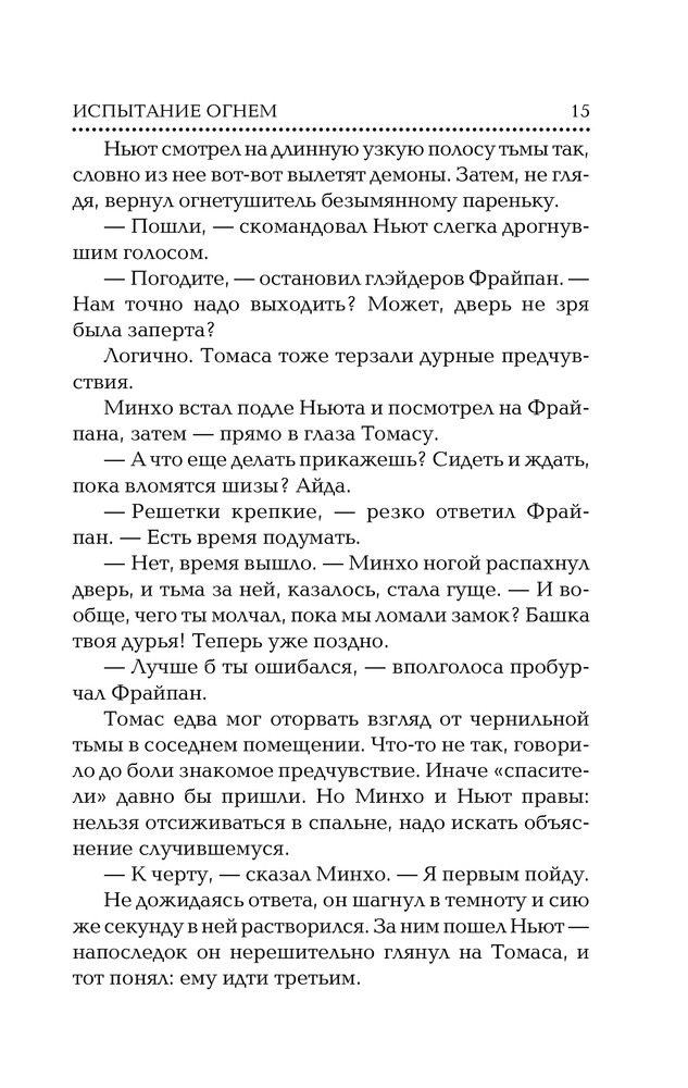 Не знаю, о чем думали продюсеры фильма - потому что книга понравилась куда больше второй части кино-саги про Томаса и его друзей! Читая, видишь, как многое убрали а что-то добавили, но вот одно неизменно - как не нравилась Тереза в фильмах, так и не нравится она здесь. Гораздо, гораздо интереснее фильма!