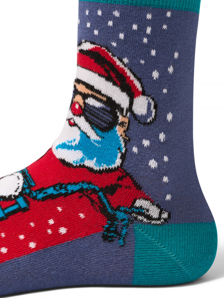 Мужские носки с красочным новогодним рисунком. Изготовлены из высококачественного мягкого хлопка, который превосходно пропускает воздух, приятно ощущается на теле и походит для чувствительной кожи. Удобная резинка и кеттельный (плоский) шов на мыске обеспечивают максимальный комфорт. Износостойкие, прочные носки идеально облегают и отлично сохраняют форму и насыщенность цвета после стирок. Яркие новогодние носки — идеальный аксессуар для создания атмосферы праздника и исполнения желаний. Красочные и узнаваемые символы Нового года позволят с каждым шагом окунуться в мир волшебства и будут радовать актуальными принтами каждый день. Отличный подарок на праздники.